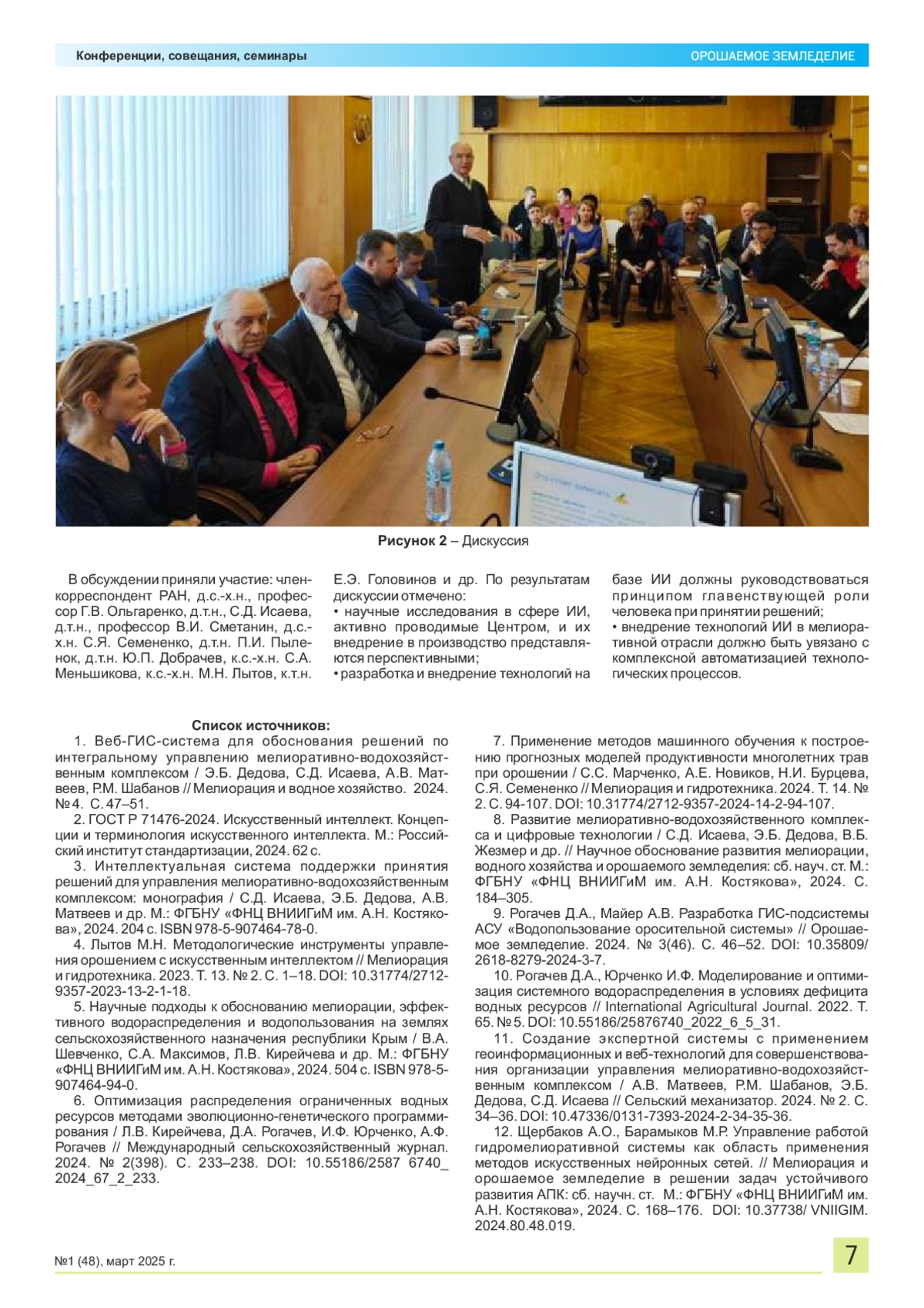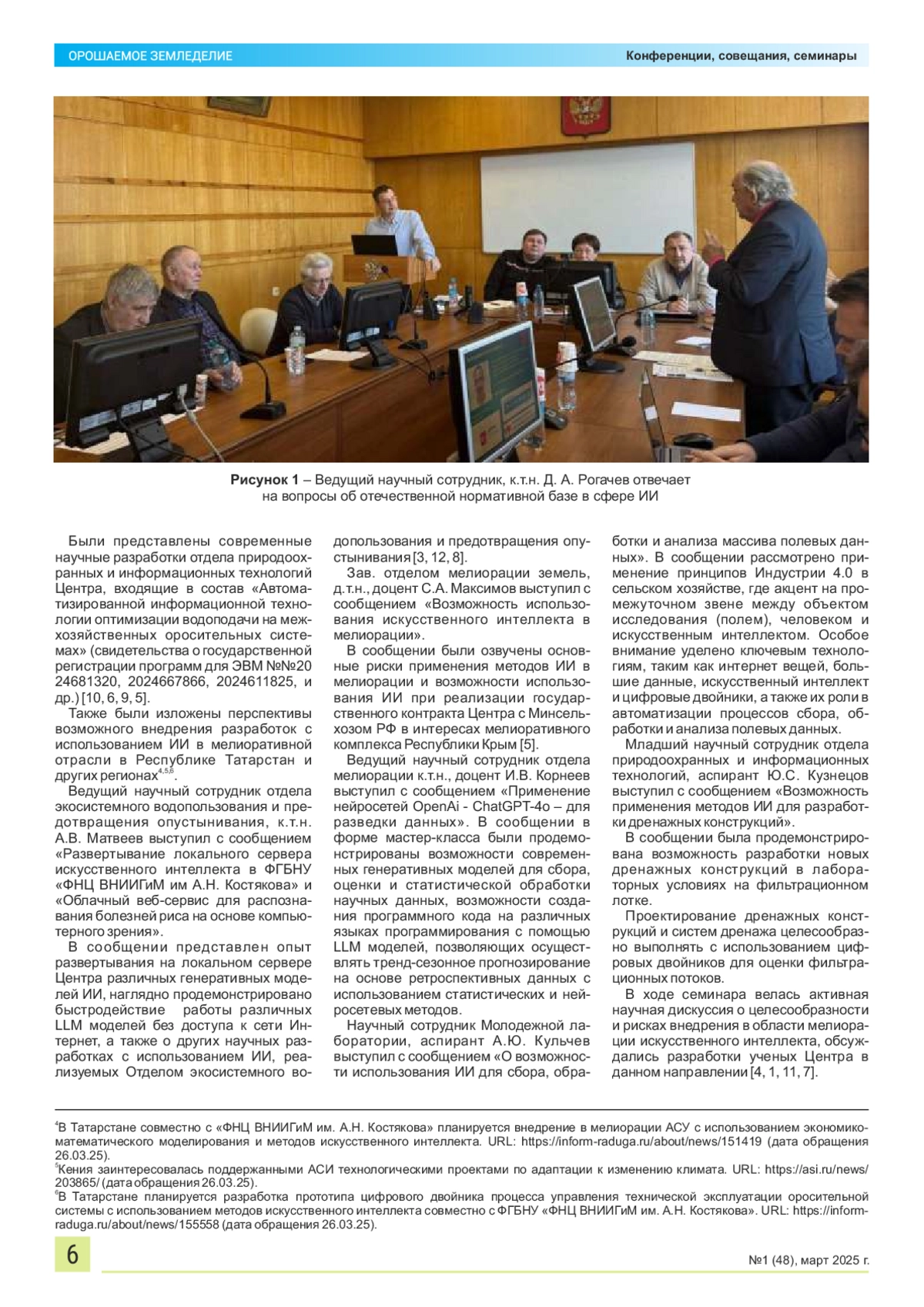 В Федеральном научном центре гидротехники и мелиорации им. А. Н. Костякова (г. Москва) 20.03.2025 прошел научно-практический семинар «Цифровая трансформация и искусственный интеллект в АПК», посвященный внедрению современных информационных технологий с использованием искусственного интеллекта (ИИ) в сельском хозяйстве и мелиорации