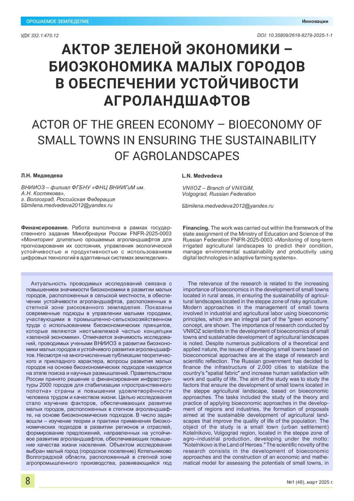 Актуальность проводимых исследований связана с повышением значимости биоэкономики в развитии малых городов, расположенных в сельской местности, в обеспечении устойчивости агроландшафтов, расположенных в степной зоне рискованного земледелия. Показаны современные подходы в управлении малыми городами, участвующими в промышленно-сельскохозяйственном труде с использованием биоэкономических принципов, которые являются неотъемлемой частью концепции «зеленой экономики». Отмечается значимость исследований, проводимых учеными ВНИИОЗ в развитии биоэкономики малых городов и устойчивого развития агроландшафтов. Несмотря на многочисленные публикации теоретического и прикладного характера, вопросы развития малых городов на основе биоэкономических подходов находятся на этапе поиска и научных размышлений. Правительством России принято решение о финансирования инфраструктуры 2000 городов для стабилизации «пространственного полотна» страны и повышении удовлетворённости человека трудом и качеством жизни. Целью исследования стало изучение факторов, обеспечивающих развитие малых городов, расположенных в степном агроландшафте, на основе биоэкономических подходов. В число задач вошли – изучение теории и практики применения биоэкономических подходов в развитии регионов и отраслей, формирование предложений, направленных на устойчивое развитие агроландшафтов, обеспечивающих повышение качества жизни населения. Объектом исследования выбран малый город (городское поселение) Котельниково Волгоградской области, расположенный в степной зоне агропромышленного производства, развивающийся под девизом: «Котельниково – Земля Героев». Научная новизна исследования состоит в разработке биоэкономических подходов и построении экономико-математической модели оценки потенциалов малых городов, в перманентном усилении взаимозависимостей городской и сельской экономик, в обеспечении устойчивости агроландшафтов. Исследование показывает, что эффективное функционирование малого города определяется рядом факторов, в числе которых: позиция региональных властей, лидерские качества руководителя города, слаженная работа коллектива, направленного на внедрение биоэкономических принципов, обеспечивающих рачительное отношение к природным ресурсам, особенно на тех территориях, где организовано сельскохозяйственное производство и технологическая переработка доходности под экологические проекты мелиорации.