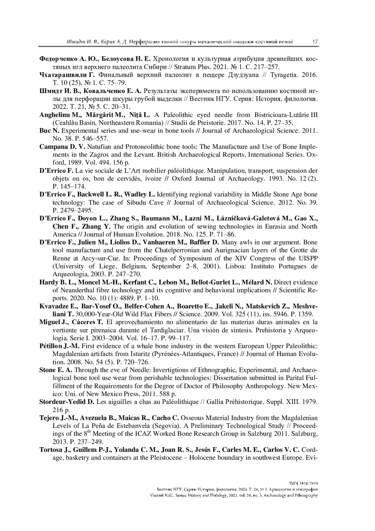 11. Шмидт И. В., Ковальченко Е. А. Результаты эксперимента по использованию костяной иглы для перфорации шкуры грубой выделки // Вестник НГУ. Серия: История, филология. 2022. Т. 21, № 5. С. 20-31.