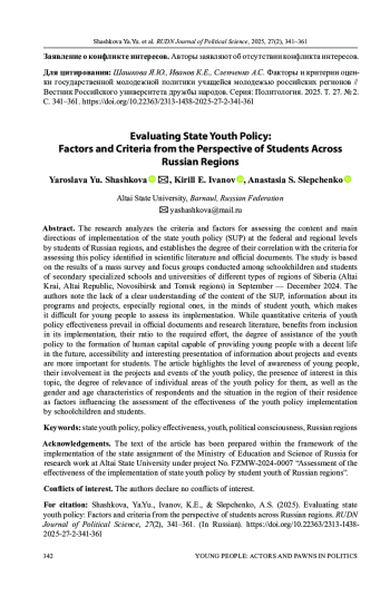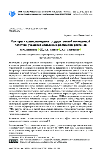 В центре внимания исследования - критерии и факторы оценки учащейся молодежью российских регионов содержания и основных направлений реализации государственной молодежной политики (ГМП) на федеральном и региональном уровнях. Авторами установлена степень их корреляции с критериями оценки данной политики, выделяемыми в научной литературе и официальных документах. Исследование базируется на результатах массового опроса и фокус-групп, проведенных среди школьников и студентов ссузов и вузов разных типов регионов Сибири (Алтайский край, Республика Алтай, Новосибирская и Томская области) в сентябре - декабре 2024 г. Отмечено отсутствие в сознании учащейся молодежи четкого представления о содержании ГМП, информации о ее программах и проектах, особенно региональных, что затрудняет для молодых людей оценку ее реализации. Если в официальных документах и исследовательской литературе преобладают количественные критерии эффективности молодежной политики, то для учащейся молодежи более важны выгоды от включения в ее реализацию, их соотношение с требуемыми затратами усилий, степень содействия ГМП формированию человеческого капитала, способного обеспечить молодым людям достойную жизнь в будущем, доступность и интересная подача информации о проектах и мероприятиях. В качестве факторов, влияющих на оценку школьниками и студентами эффективности реализации ГМП, выделены степень информированности молодежи, ее включенность в проекты и мероприятия ГМП, наличие интереса к данной теме, степень актуальности для них отдельных направлений ГМП, а также гендерные, возрастные характеристики респондентов и ситуация в регионе их проживания.