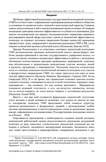 Проблема эффективной реализации государственной молодежной политики (ГМП) в соответствии с современными трансформациями российского общества и условиями его развития носит сложный и многоаспектный характер. Главным, самым дискуссионным в ней и малоисследованным является вопрос об операционализации, критериях понятия «эффективность» и субъекте ее оценивания. Для многих исследователей сам процесс последовательного нормативно- правового регулирования данной сферы выступает одним из показателей эффективности, поскольку он отражает системное закрепление базовых ценностей, принципов, приоритетных задач, направлений и механизмов реализации ГМП в РФ, согласование полномочий органов публичной власти [Князькова, Власова 2023].