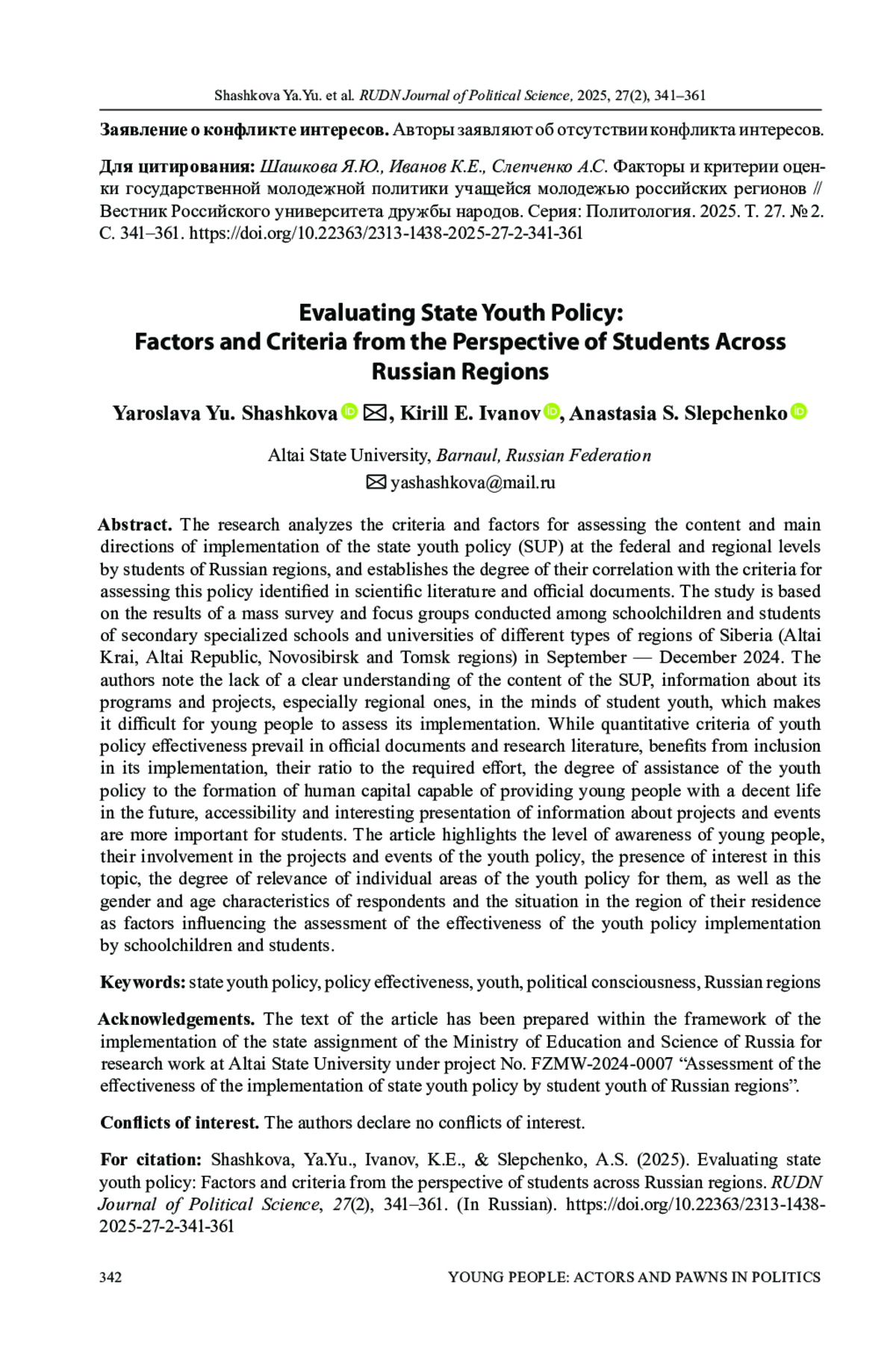 10. Подъячев К.В., Халий И.А. Государственная молодежная политика в современной России: концепт и реалии // Вестник Российского университета дружбы народов. Серия: Социология. 2020. Т. 20, № 2. C. 263-276. DOI: 10.22363/2313-2272-2020-20-2-263-276 EDN: LAIUVK