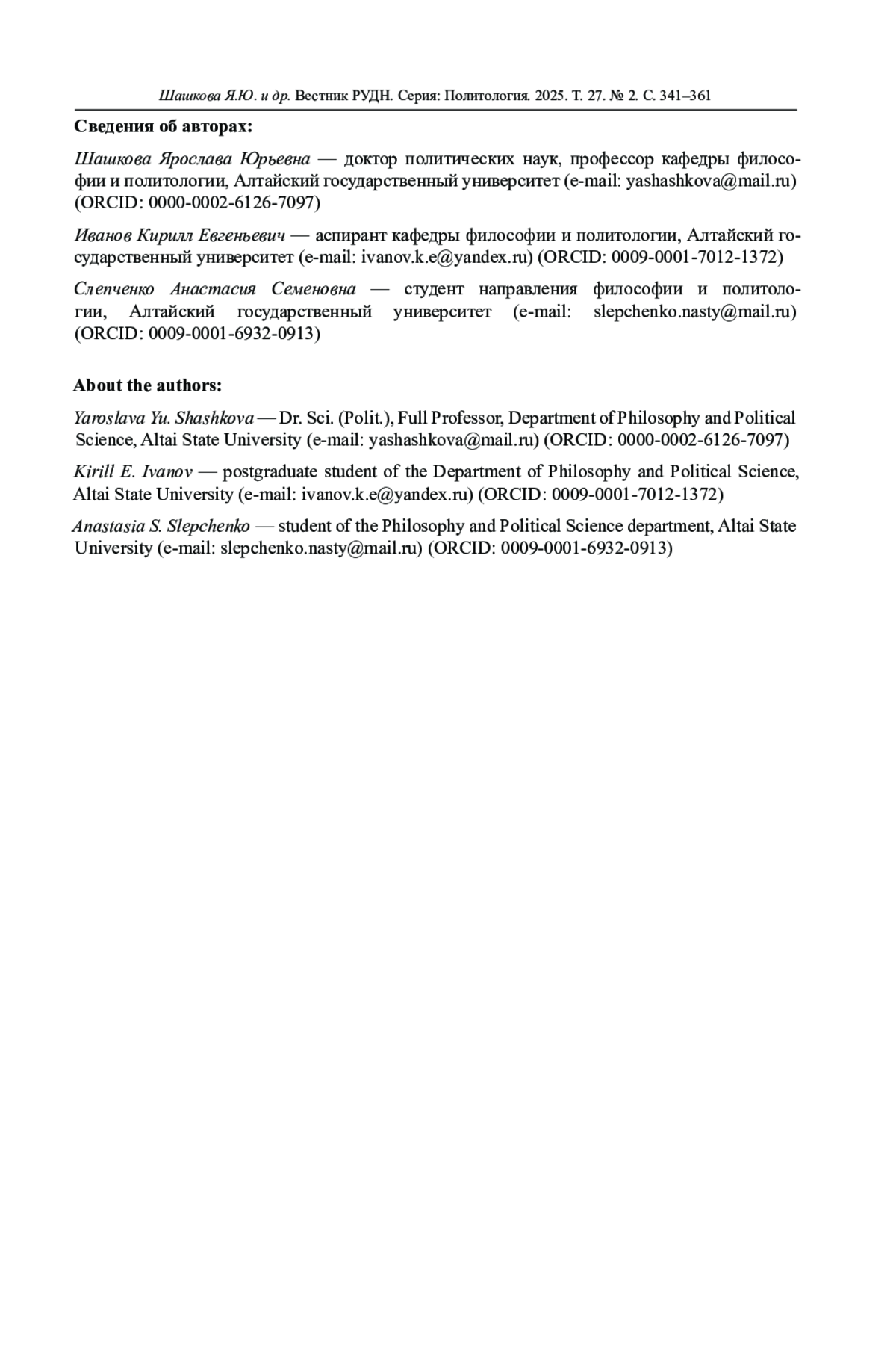 14. Шашкова Я.Ю., Асеева Т.А., Киреева О.С. Государственная молодежная политика РФ в представлениях поколения “Born Digital” (кейс Сибирского федерального округа) // Вестник Томского государственного университета. Философия. Социология. Политология. 2021. № 62. С. 160-172. DOI: 10.17223/1998863X/62/14 EDN: NVWHAB