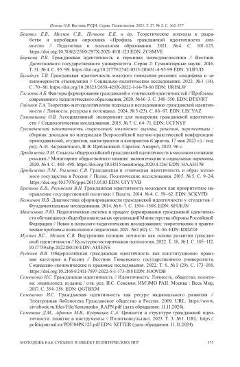 17. Семененко И.С. Гражданская идентичность как ресурс национального развития // Электронная библиотека Гражданское общество в России. 2009. URL: https://www.civisbook.ru/files/File/Semenenko_RAPN.pdf (дата обращения: 11.11.2024). EDN: XMAQIO