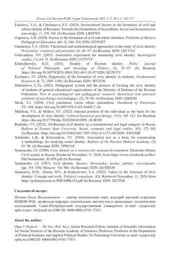 20. Федотова В.А., Черкасова Е.В. Социокультурные факторы формирования гражданской и этнической идентичности россиян: к постановке проблемы // Социально-гуманитарные знания. 2023. № 11. С. 138-143. EDN: LRSFWE