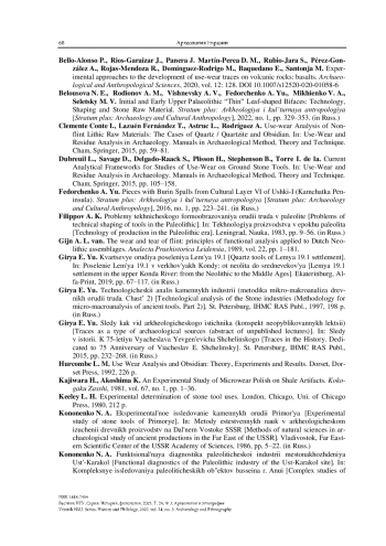 24. Clemente Conte I., Lazuén Fernández T., Astruc L., Rodríguez A. Use-wear Analysis of Nonflint Lithic Raw Materials: The Cases of Quartz / Quartzite and Obsidian // Use-Wear and Residue Analysis in Archaeology. Manuals in Archaeological Method, Theory and Technique. Cham: Springer, 2015. P. 59-81.