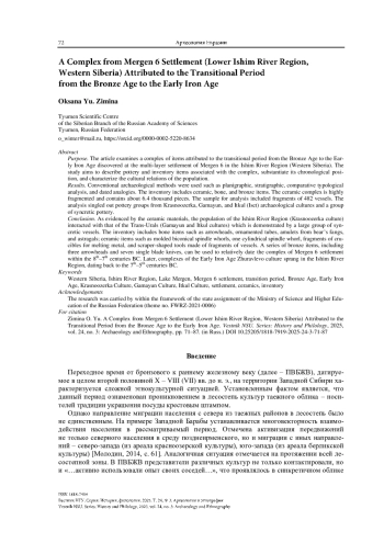 Рассматривается комплекс материалов переходного времени от бронзового века к раннему железному, обнаруженных на многослойном поселении Мергень 6 в Приишимье (Западная Сибирь). Целью исследования является описание керамики и предметов инвентаря, соотносимых с комплексом переходного времени, обоснование хронологической позиции комплекса и характеристика культурных связей населения. Предшествующие исследования показали, что керамические материалы переходного времени, составляющие значительную серию, свидетельствуют о взаимодействии населения Приишимья (красноозерская культура) и Зауралья (гамаюнская и иткульская культуры), что демонстрирует большая группа сосудов синкретичного облика. Инвентарь представлен костяными наконечниками стрел, орнаментированными трубочками-игольниками из кости, скребковидными орудиями из фрагментов сосудов, лепными пряслицами, амулетами из клыков медведя, астрагалами. Датирующими являются бронзовые изделия – три наконечника стрел и однолезвийные ножи, которые в основном указывают на VIII–VII вв. до н. э.