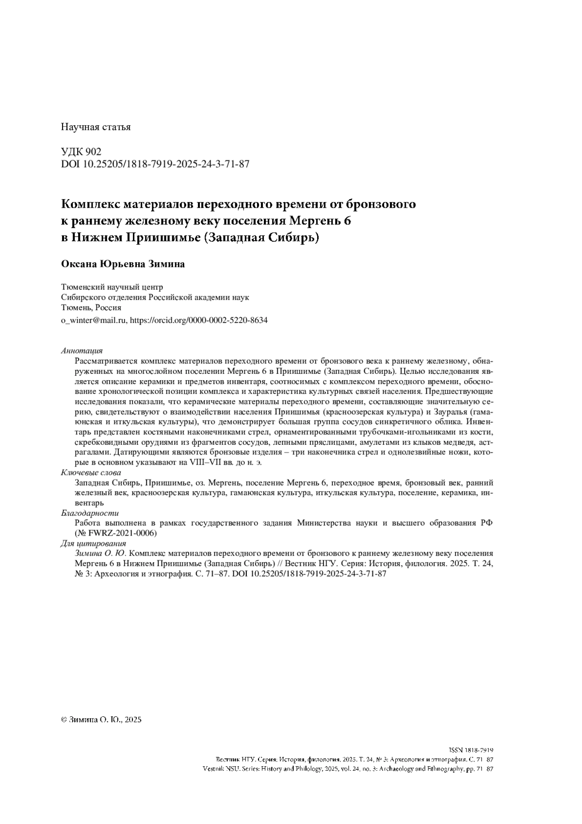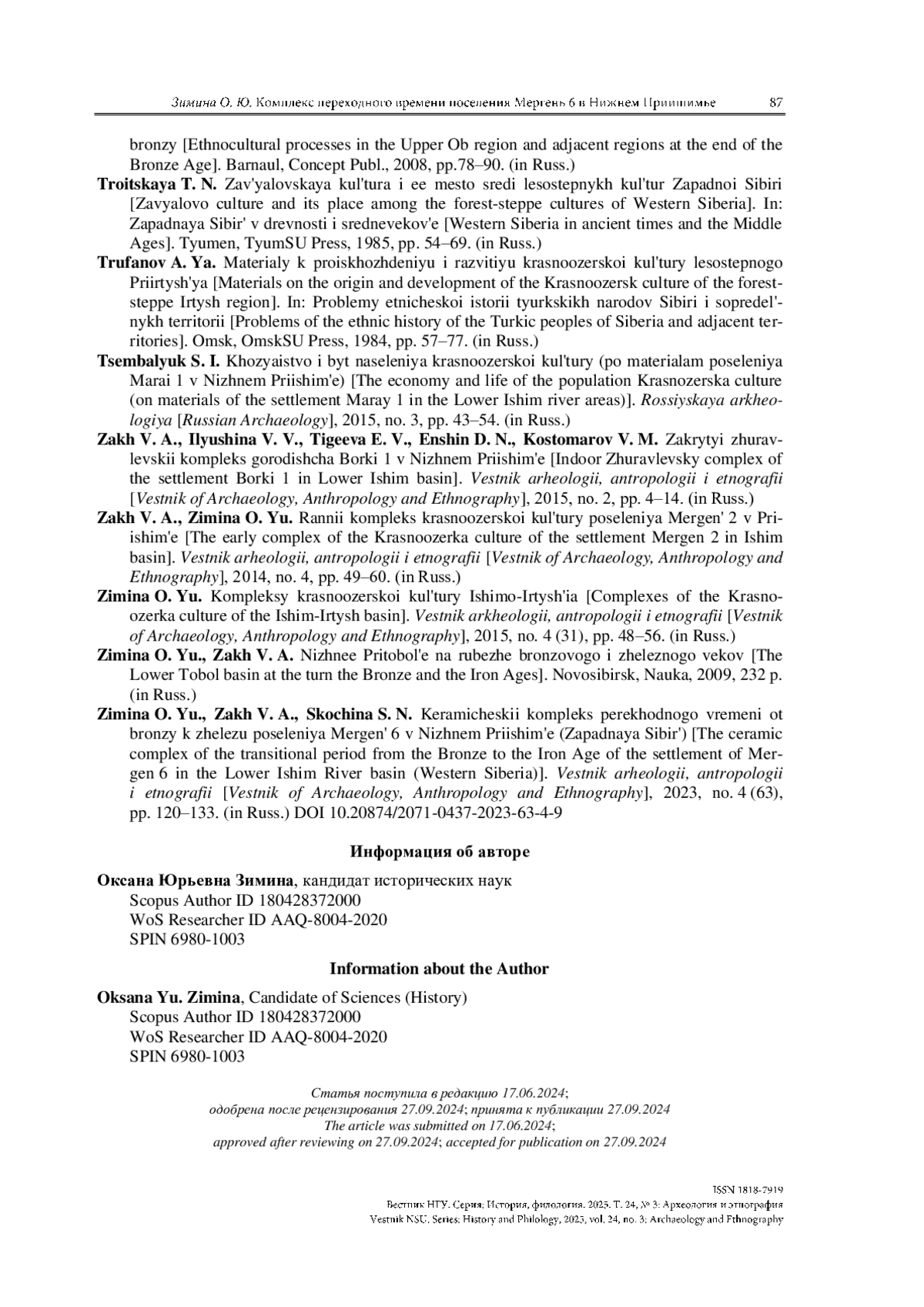 14. Зимина О. Ю., Зах В. А., Скочина С. Н. Керамический комплекс переходного времени от бронзы к железу поселения Мергень 6 в Нижнем Приишимье (Западная Сибирь) // Вестник археологии, антропологии и этнографии. 2023. № 4 (63). С. 120-133 https://doi.org/10.20874/2071-0437-2023-63-4-9