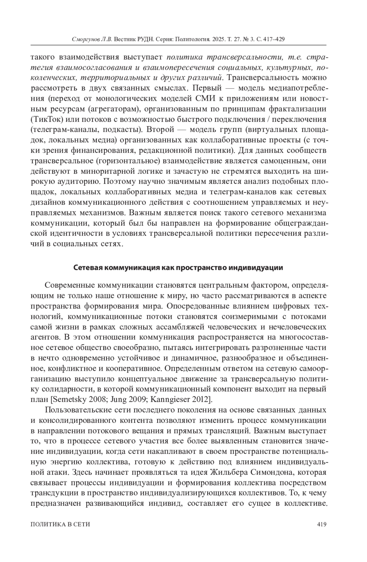 В современных условиях, когда сетевое пространство активно используется человеком как источник информации и коммуникации, взаимодействие онлайн выступает мощным средством формирования политических ценностей и идентичностей, влияющих на политическое позиционирование и деятельность. В процессе сетевого взаимодействия проявляются механизмы управляемой и неуправляемой убеждающей коммуникации. Важным свойством такого взаимодействия выступает политика трансверсальности, т. е. стратегия взаимосогласования и взаимопересечения социальных, культурных, поколенческих, территориальных и других различий.