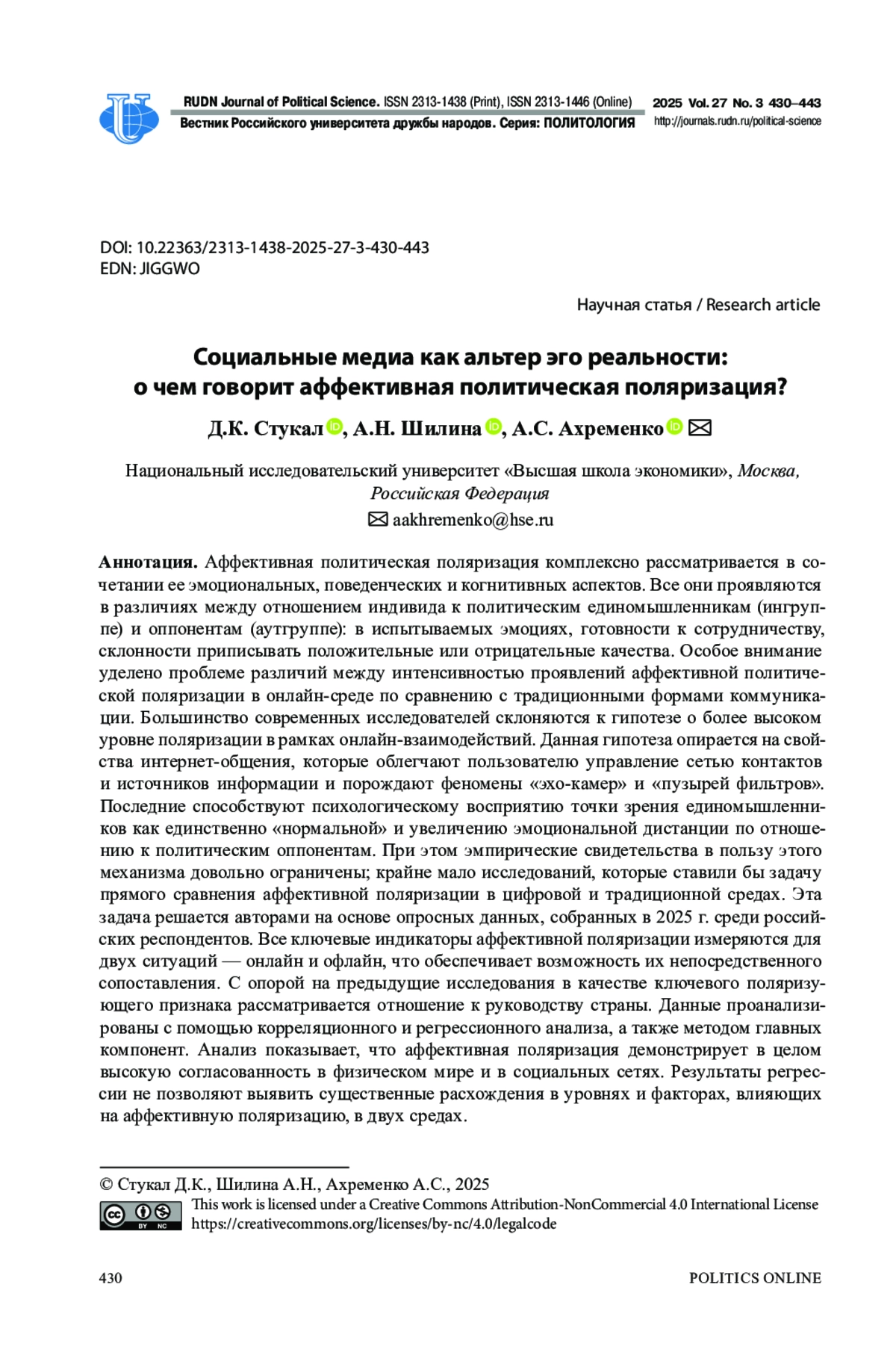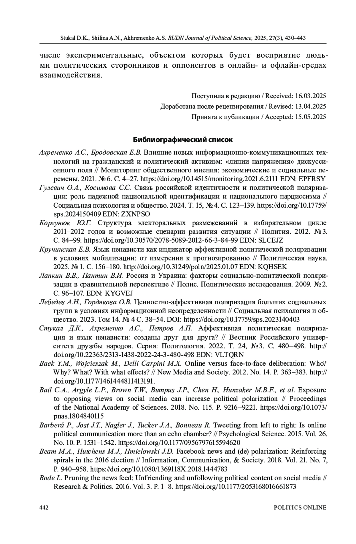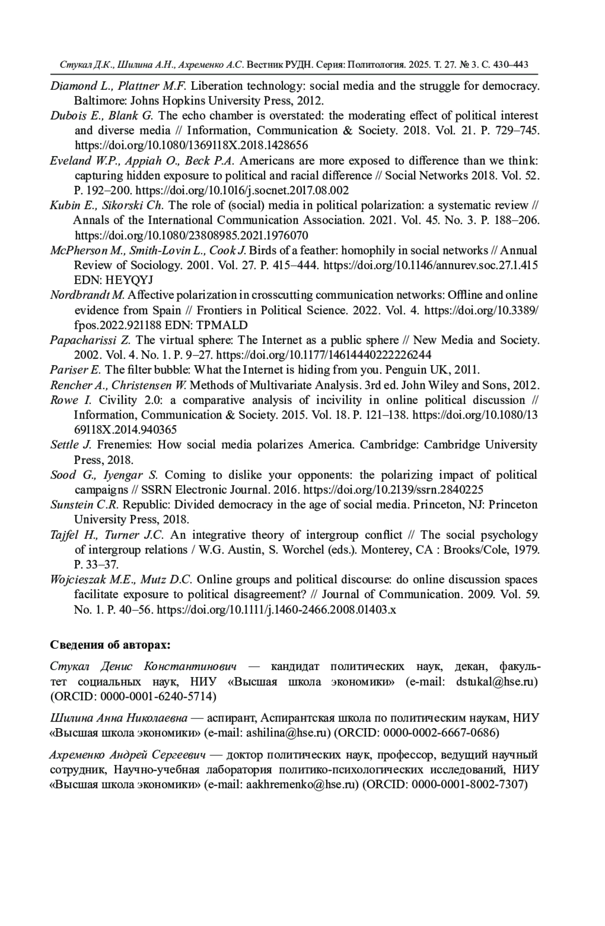 7. Стукал Д.К., Ахременко А.С., Петров А.П. Аффективная политическая поляризация и язык ненависти: созданы друг для друга? // Вестник Российского университета дружбы народов. Серия: Политология. 2022. Т. 24, № 3. С. 480-498. DOI: 10.22363/2313-1438-2022-24-3-480-498 EDN: VLTQRN
