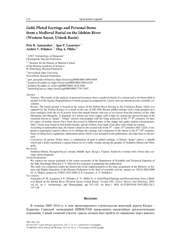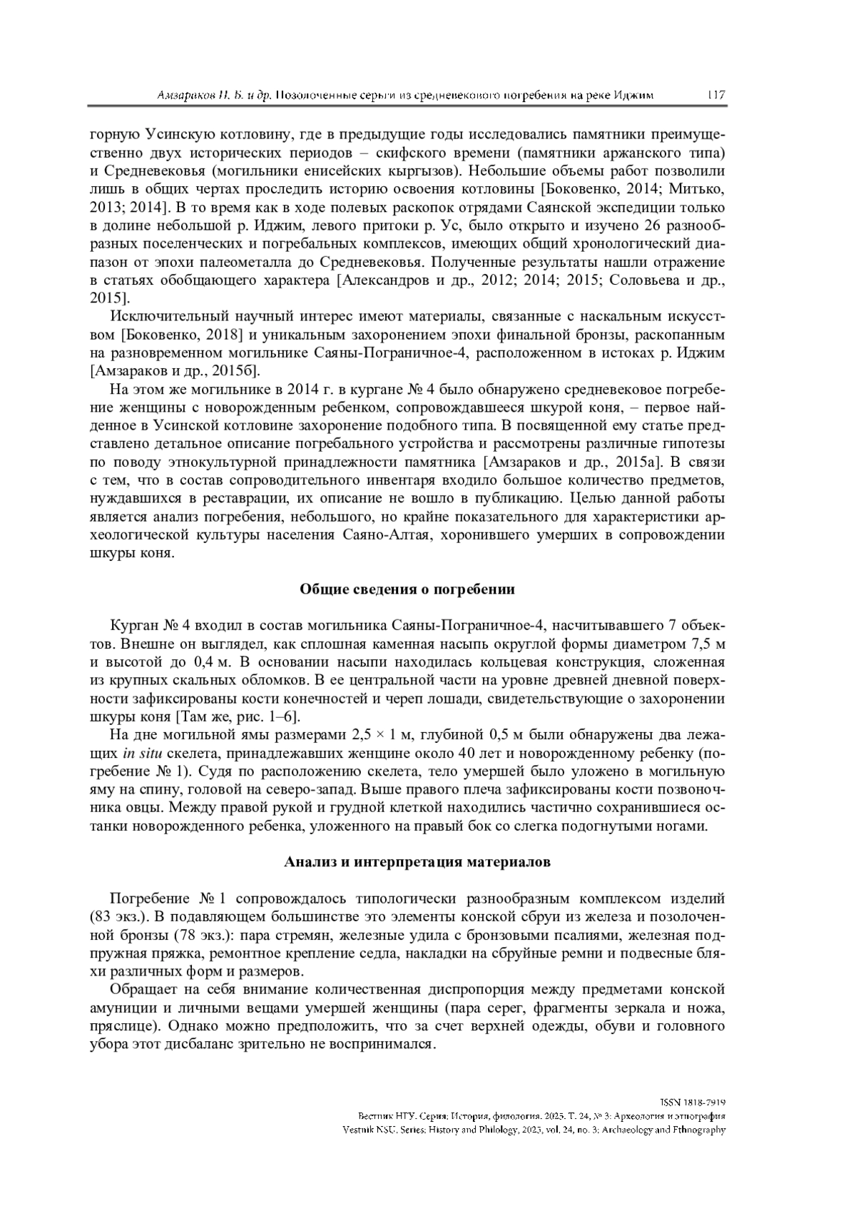 В научный оборот вводятся результаты анализа личного инвентаря из сопровождавшегося шкурой коня средневекового захоронения женщины и новорожденного ребенка. По радиоуглеродным данным погребение датируется второй половиной IX – началом XIII в. Бронзовые позолоченные серьги с длинной подвеской имеют близкие аналогии из набора украшений элитных женских захоронений с конем с территории Горного Алтая и Монголии. На фрагменте зеркала, отлитого из меди с высоким содержанием олова, сохранилась часть орнамента, известного как «виноградный». Сделан вывод о том, что в древнетюркское время сочетание золотых или позолоченных серег, китайского «виноградного зеркала», пряслица и ножа составлял типичный погребальный набор знатной женщины у народов Южной Сибири и Монголии.
