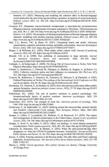 3. Соловьев В.А. Динамика идеологической поляризации в пространстве русскоязычных Telegram-каналов: моделирование методами машинного обучения // Политическая наука. 2025. № 1. С. 240-259. http://www. DOI: 10.31249/poln/2025.01.11 EDN: MXKGQO