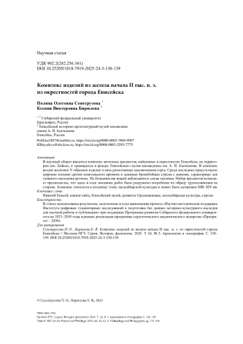 В научный оборот вводится комплекс железных предметов, найденных в окрестностях Енисейска, на территории пос. Байкал, и хранящихся в фондах Енисейского музея-заповедника им. А. И. Кытманова. В комплекс входят железное Y-образное изделие и пять разнотипных наконечников стрел. Среди последних присутствуют широкие плоские срезни монгольского времени и длинные бронебойные стрелы с шипами, характерные для таежного населения региона. На большинстве вещей наблюдаются следы окалины. Набор предметов позволяет предполагать, что здесь в ходе земляных работ было разрушено погребение по обряду трупосожжения на стороне. Комплекс относится к позднему этапу лесосибирской культуры и может быть датирован XIII–XIV вв.