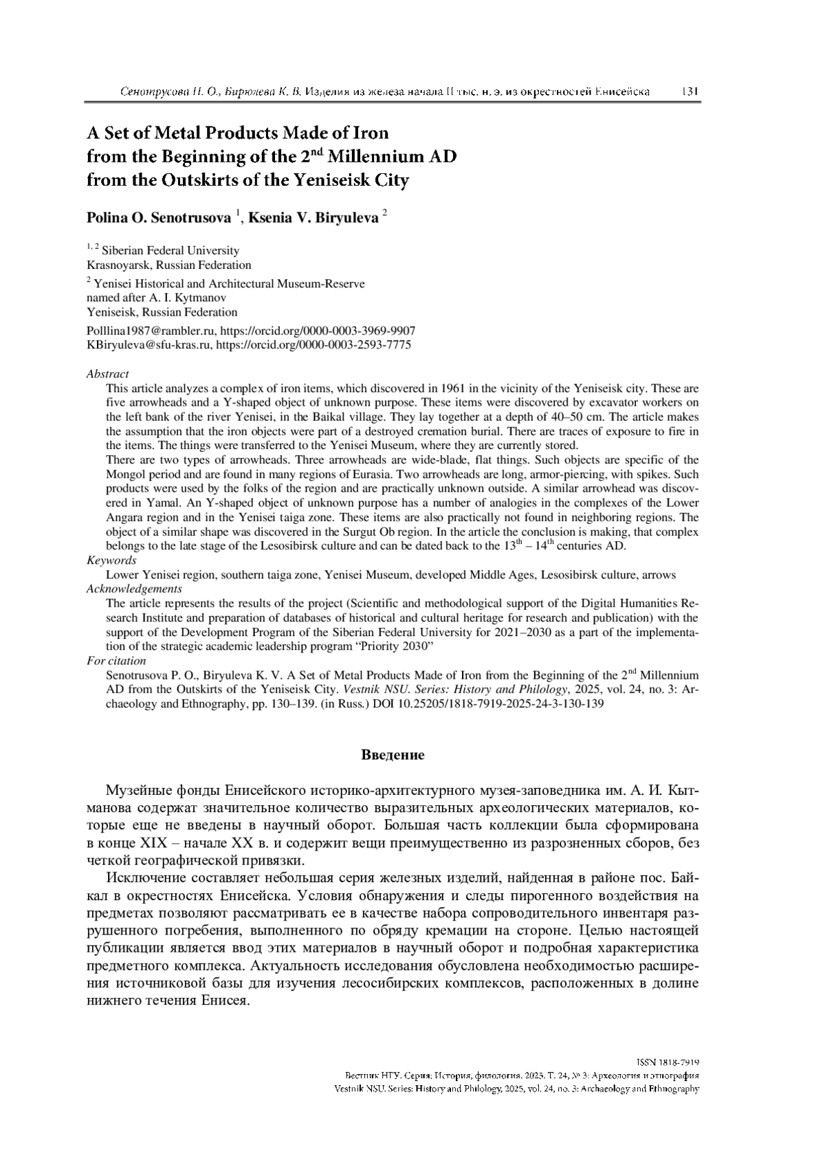 10. Мандрыка П. В., Сенотрусова П. О. Культурная принадлежность памятников развитого Средневековья южнотаежной зоны Средней Сибири // РА. 2018. № 2. С. 98-112.