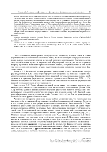 Проводится описание и сопоставление метафорических концептов, лежащих в основе системной и дискурсивной фразеологии китайского языка. Целью данного исследовании является обсуждение принципов выделения устойчивых сверхсловных единиц и их классификации в китайской лингвистической традиции. Показано, что китайские лингвисты стремятся объединить структурные и семантические основания классификации, в результате чего границы выделяемых классов устойчивых словосочетаний становятся размытыми. Предпринимается попытка разграничить разные типы китайских фразеологизмов. Анализируются модели метафоризации и наиболее частотные метафорические концепты, формирующие фразеологические образы в китайском языке. Проводится сопоставление метафорических моделей формирования фразеологизмов в языке и кинодискурсе (жанр комедии). Проведенный анализ на материале лексикографических источников и комедийного кинодискурса в китайском языке позволил установить специфику характерных для китайского языка метафорических концептов.