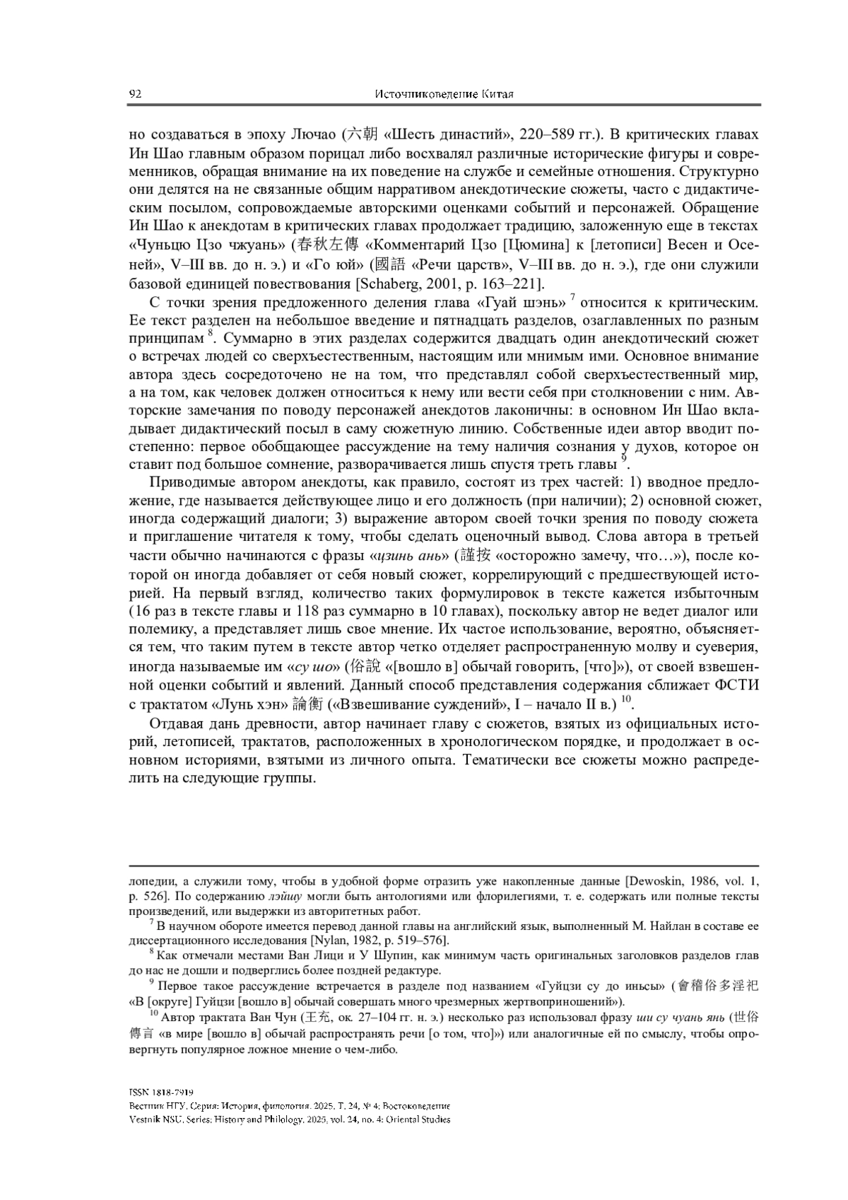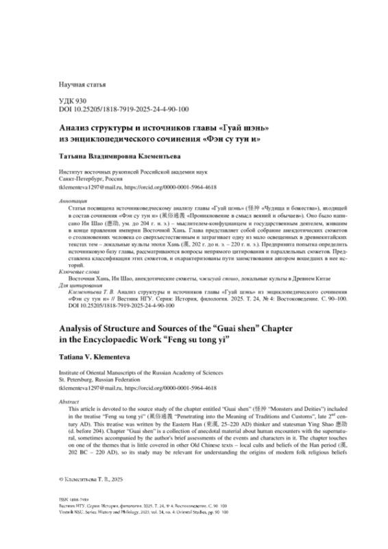 Cтатья посвящена источниковедческому анализу главы «Гуай шэнь» (怪神 «Чудища и божества»), входящей в состав сочинения «Фэн су тун и» (風俗通義 «Проникновение в смысл веяний и обычаев»). Оно было написано Ин Шао (應劭, ум. до 204 г. н. э.) – мыслителем-конфуцианцем и государственным деятелем, жившим в конце правления империи Восточной Хань. Глава представляет собой собрание анекдотических сюжетов о столкновениях человека со сверхъестественным и затрагивает одну из мало освещенных в древнекитайских текстах тем – локальные культы эпохи Хань (漢, 202 г. до н. э. – 220 г. н. э.). Предпринята попытка определить источниковую базу главы, рассматриваются вопросы непрямого цитирования и параллельных сюжетов. Представлена классификация этих сюжетов, и охарактеризованы пути заимствования автором вошедших в нее историй.