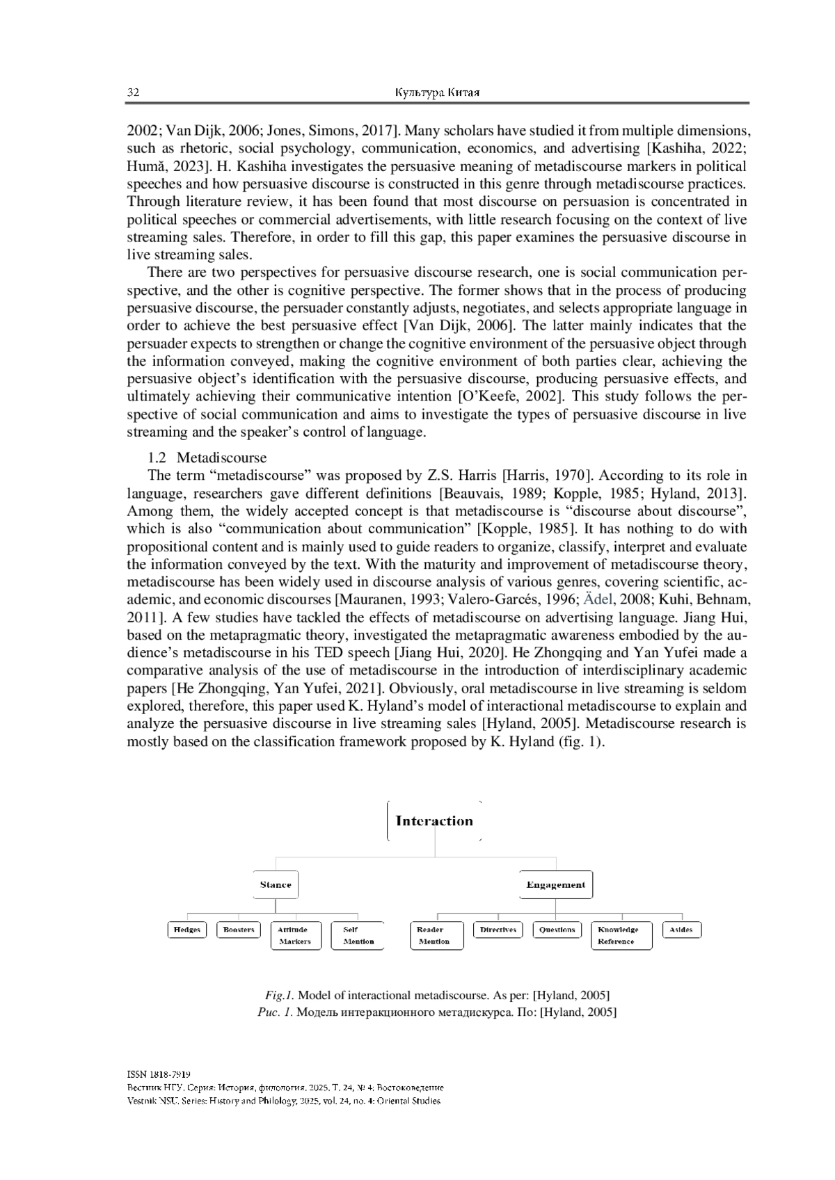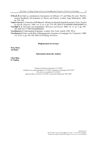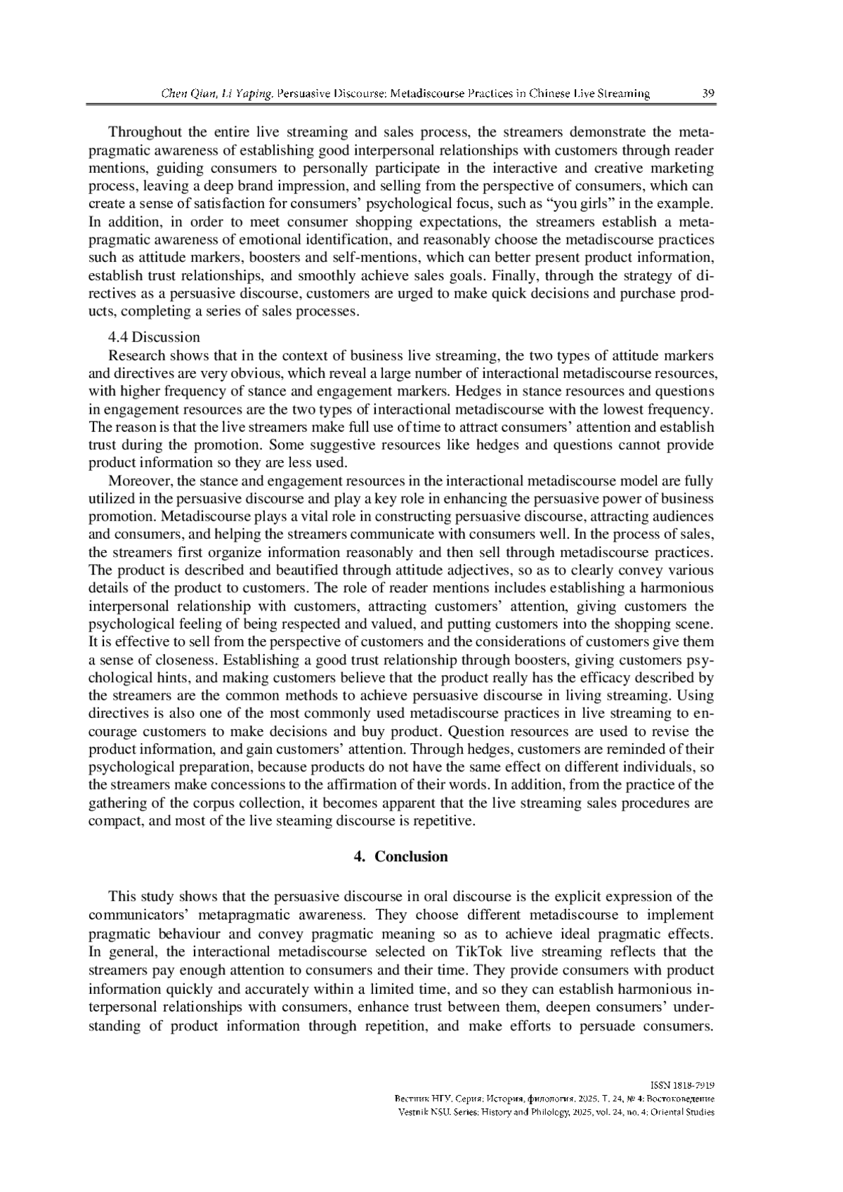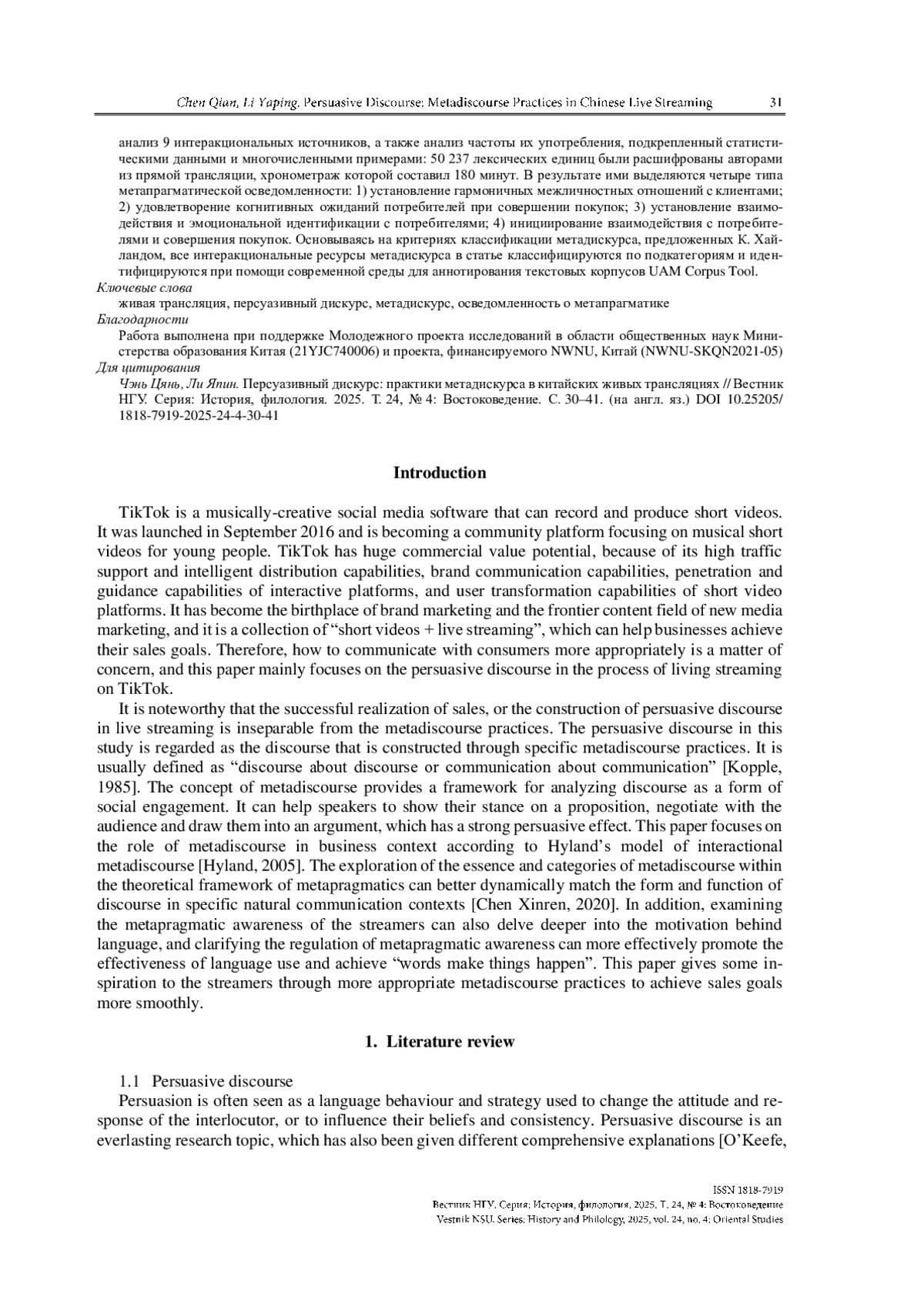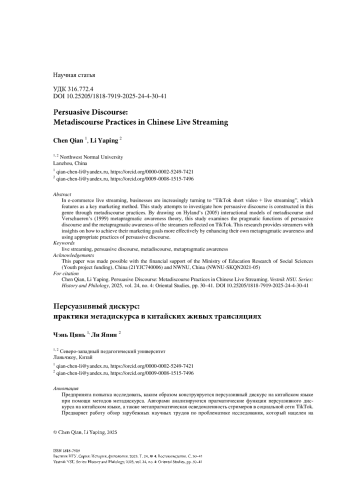 Предпринята попытка исследовать, каким образом конструируется персуазивный дискурс на китайском языке при помощи методов метадискурса. Авторами анализируются прагматические функции персуазивного дискурса на китайском языке, а также метапрагматическая осведомленность стримеров в социальной сети TikTok. Предваряет работу обзор зарубежных научных трудов по проблематике исследования, который нацелен на анализ 9 интеракциональных источников, а также анализ частоты их употребления, подкрепленный статистическими данными и многочисленными примерами: 50 237 лексических единиц были расшифрованы авторами из прямой трансляции, хронометраж которой составил 180 минут. В результате ими выделяются четыре типа метапрагматической осведомленности: