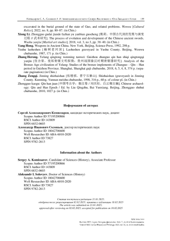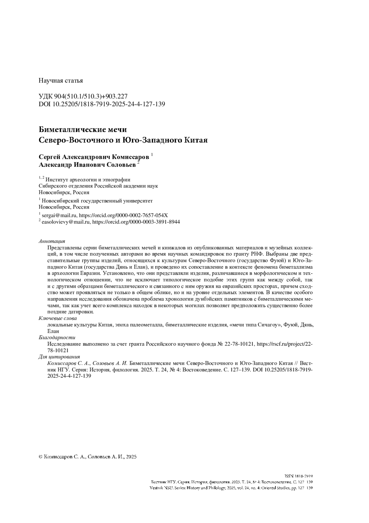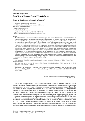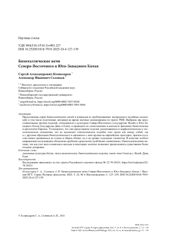 Представлены серии биметаллических мечей и кинжалов из опубликованных материалов и музейных коллекций, в том числе полученных авторами во время научных командировок по гранту РНФ. Выбраны две представительные группы изделий, относящихся к культурам Северо-Восточного (государство Фуюй) и Юго-Западного Китая (государства Дянь и Елан), и проведено их сопоставление в контексте феномена биметаллизма в археологии Евразии. Установлено, что они представляли изделия, различавшиеся в морфологическом и технологическом отношении, что не исключает типологическое подобие этих групп как между собой, так и с другими образцами биметаллического и связанного с ним оружия на евразийских просторах, причем сходство может проявляться не только в общем облике, но и на уровне отдельных элементов. В качестве особого направления исследования обозначена проблема хронологии дунбэйских памятников с биметаллическими мечами, так как учет всего комплекса находок в некоторых могилах позволяет предположить существенно более поздние датировки.