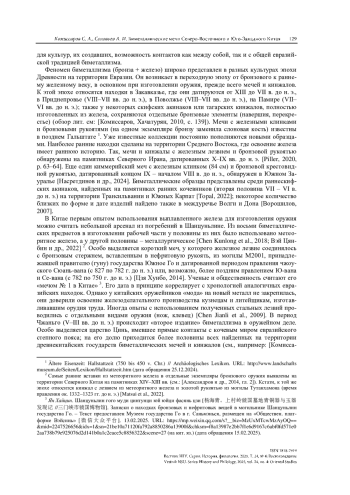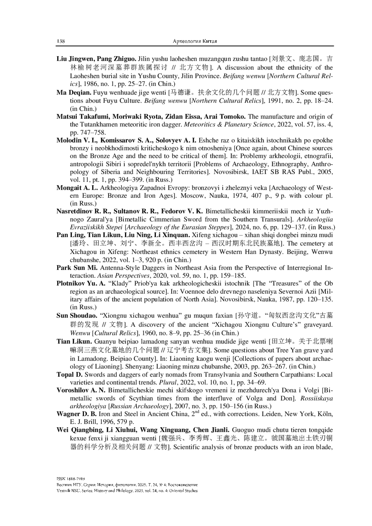 12. Chen Kunlong, Wang Yingchen, Liu Yaxing, Mei Jianjun, Jiang Tao. Meteoritic origin and manufacturing process of iron blades in two Bronze Age bimetallic objects from China // Journal of Cultural Heritage. 2018. Vol. 30. P. 48-50.