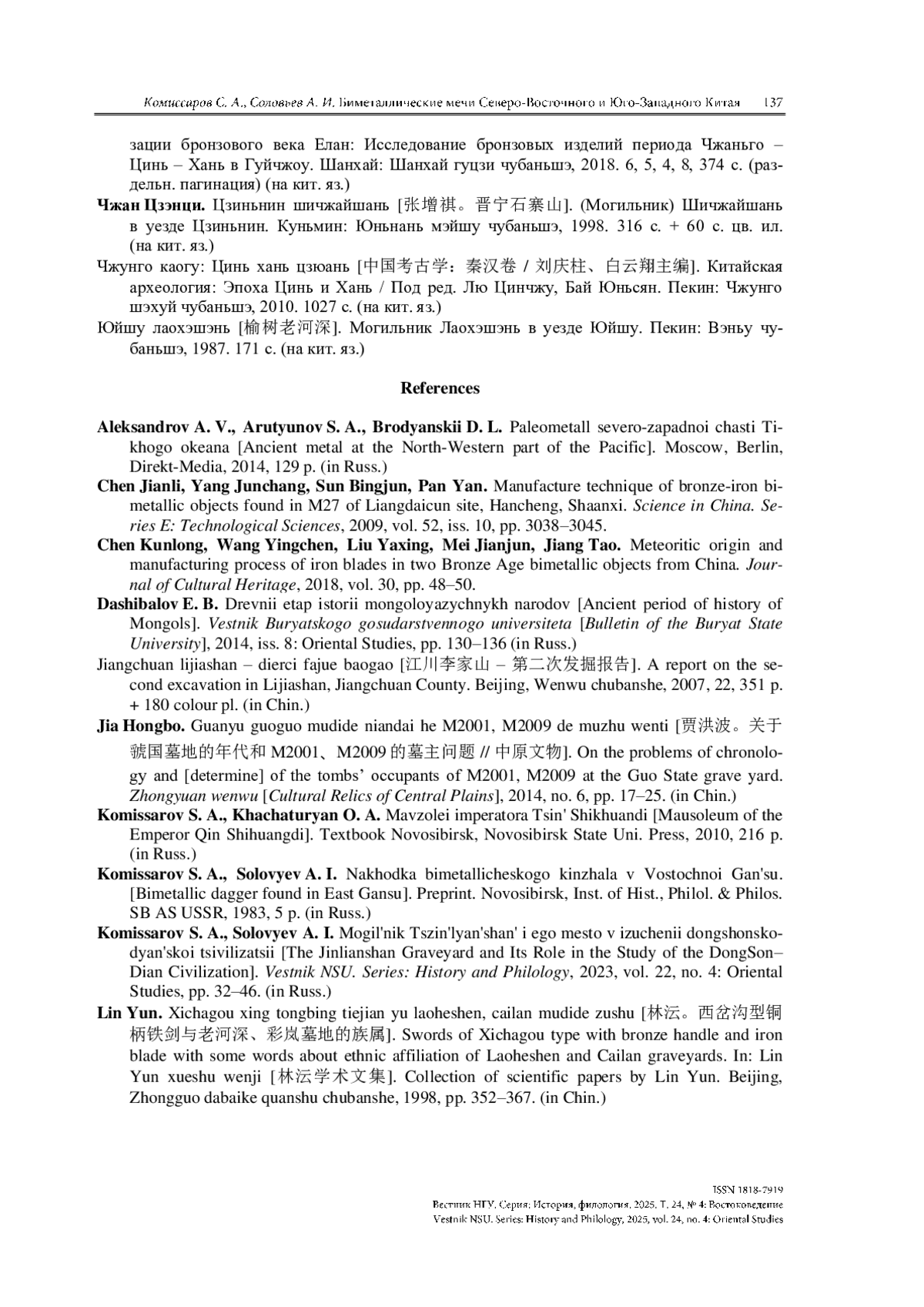 4. Комиссаров С. А., Соловьев А. И. Находка биметаллического кинжала в Восточной Ганьсу: Препринт / Ин-т истории, филологии и философии СО АН СССР. Новосибирск, 1983. 5 с.