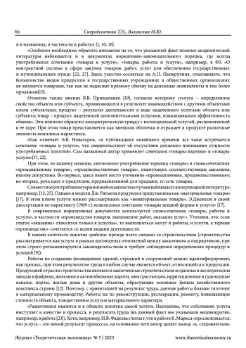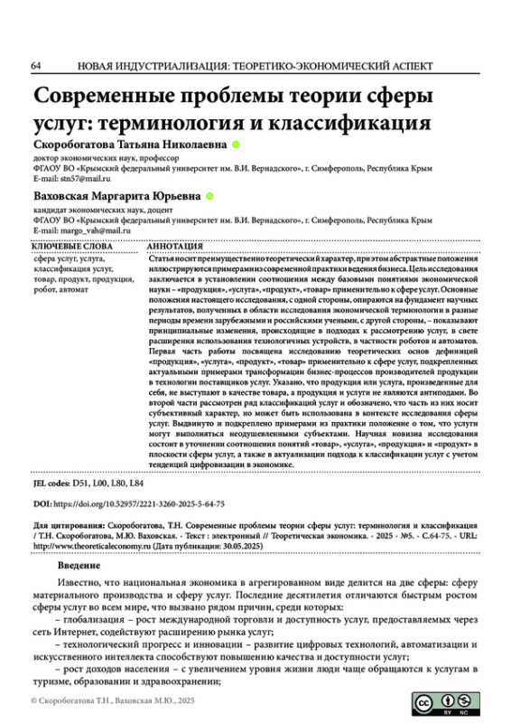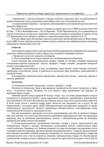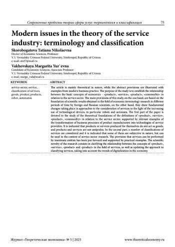 Статья носит преимущественно теоретический характер, при этом абстрактные положения иллюстрируются примерами из современной практики ведения бизнеса. Цель исследования заключается в установлении соотношения между базовыми понятиями экономической науки - «продукция», «услуга», «продукт», «товар» применительно к сфере услуг. Основные положения настоящего исследования, с одной стороны, опираются на фундамент научных результатов, полученных в области исследования экономической терминологии в разные периоды времени зарубежными и российскими учеными, с другой стороны, - показывают принципиальные изменения, происходящие в подходах к рассмотрению услуг, в свете расширения использования технологичных устройств, в частности роботов и автоматов. Первая часть работы посвящена исследованию теоретических основ дефиниций «продукция», «услуга», «продукт», «товар» применительно к сфере услуг, подкрепленных актуальными примерами трансформации бизнес-процессов производителей продукции в технологии поставщиков услуг. Указано, что продукция или услуга, произведенные для себя, не выступают в качестве товара, а продукция и услуги не являются антиподами. Во второй части рассмотрен ряд классификаций услуг и обозначено, что часть из них носит субъективный характер, но может быть использована в контексте исследования сферы услуг. Выдвинуто и подкреплено примерами из практики положение о том, что услуги могут выполняться неодушевленными субъектами. Научная новизна исследования состоит в уточнении соотношения понятий «товар», «услуга», «продукция» и «продукт» в плоскости сферы услуг, а также в актуализации подхода к классификации услуг с учетом тенденций цифровизации в экономике.