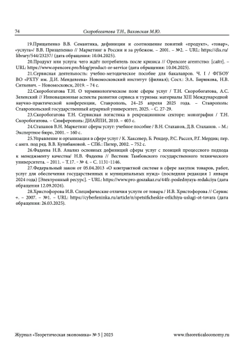 22. Скоробогатова Т.Н. О терминологическом поле сферы услуг / Т.Н. Скоробогатова, А.С. Зеленский // Инновационные аспекты развития сервиса и туризма: материалы XIII Международной научно-практической конференции, Ставрополь, 24-25 апреля 2025 года. - Ставрополь: Ставропольский государственный аграрный университет, 2025. - С. 27-29. EDN: HUKSMM