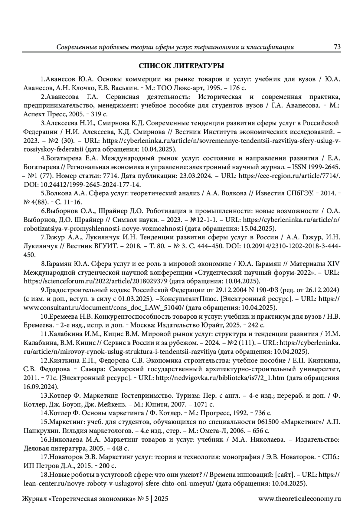 8. Гарамян Ю.А. Сфера услуг и ее роль в мировой экономике / Ю.А. Гарамян // Материалы XIV Международной студенческой научной конференции “Студенческий научный форум-2022”. - URL: https://scienceforum.ru/2022/article/2018029379 (дата обращения: 10.04.2025).