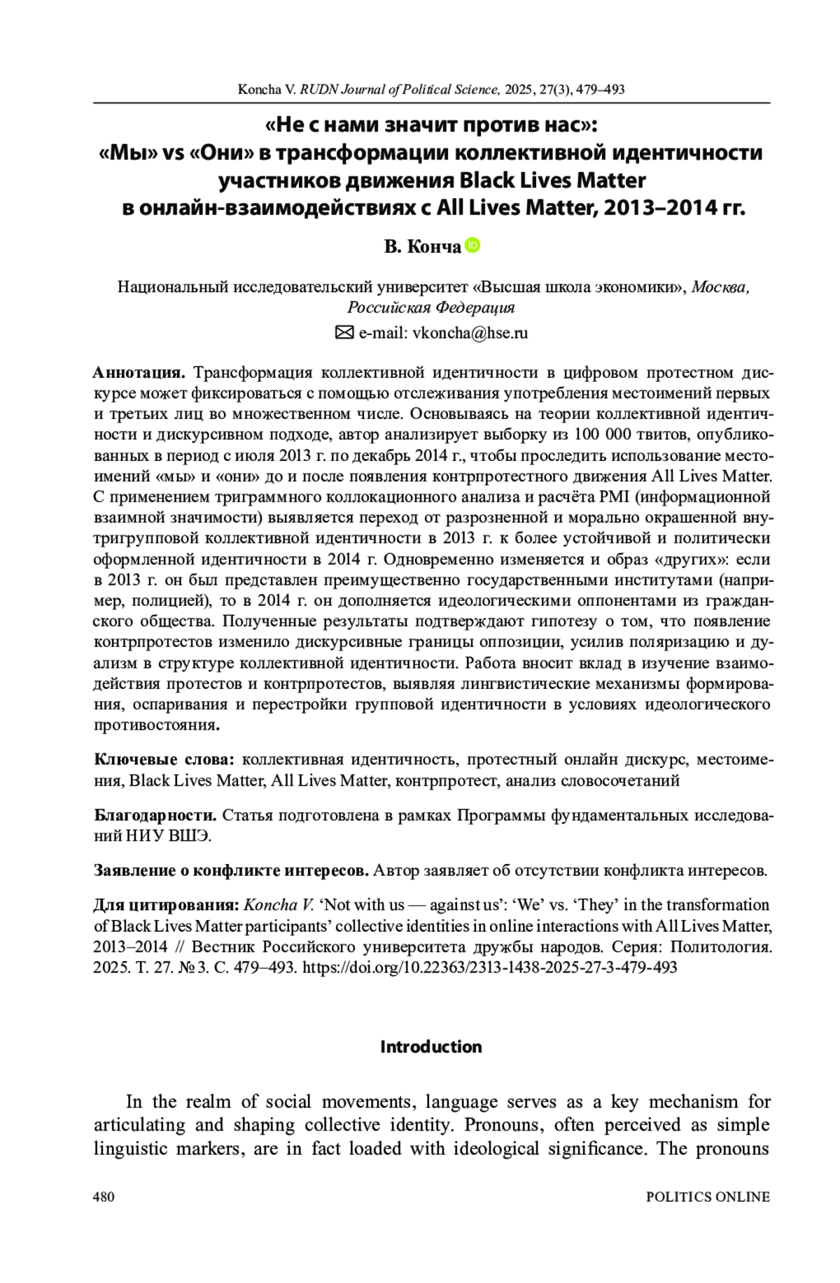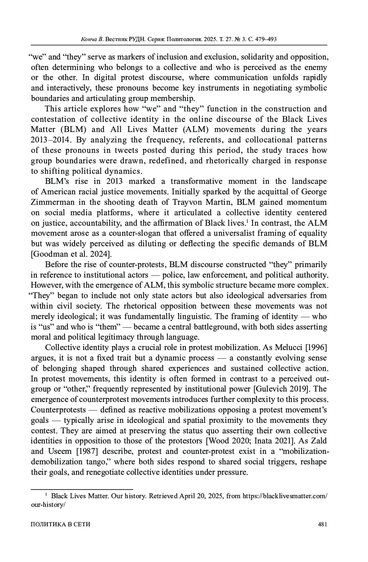 Трансформация коллективной идентичности в цифровом протестном дискурсе может фиксироваться с помощью отслеживания употребления местоимений первых и третьих лиц во множественном числе. Основываясь на теории коллективной идентичности и дискурсивном подходе, автор анализирует выборку из 100 000 твитов, опубликованных в период с июля 2013 г. по декабрь 2014 г., чтобы проследить использование местоимений «мы» и «они» до и после появления контрпротестного движения All Lives Matter. С применением триграммного коллокационного анализа и расчёта PMI (информационной взаимной значимости) выявляется переход от разрозненной и морально окрашенной внутригрупповой коллективной идентичности в 2013 г. к более устойчивой и политически оформленной идентичности в 2014 г. Одновременно изменяется и образ «других»: если в 2013 г. он был представлен преимущественно государственными институтами (например, полицией), то в 2014 г. он дополняется идеологическими оппонентами из гражданского общества. Полученные результаты подтверждают гипотезу о том, что появление контрпротестов изменило дискурсивные границы оппозиции, усилив поляризацию и дуализм в структуре коллективной идентичности. Работа вносит вклад в изучение взаимодействия протестов и контрпротестов, выявляя лингвистические механизмы формирования, оспаривания и перестройки групповой идентичности в условиях идеологического противостояния.