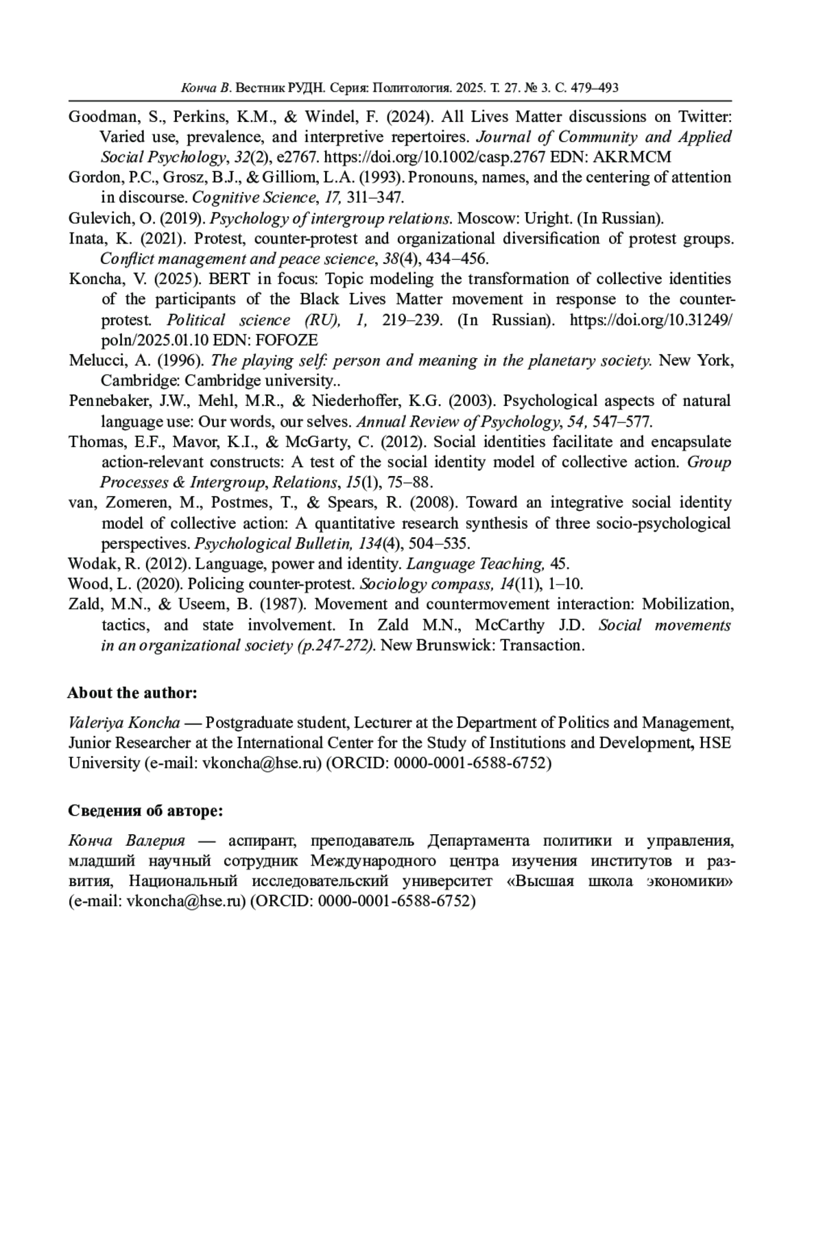 6. Koncha, V. (2025). BERT in focus: Topic modeling the transformation of collective identities of the participants of the Black Lives Matter movement in response to the counter-protest. Political science (RU), 1, 219-239. (In Russian). DOI: 10.31249/poln/2025.01.10 EDN: FOFOZE