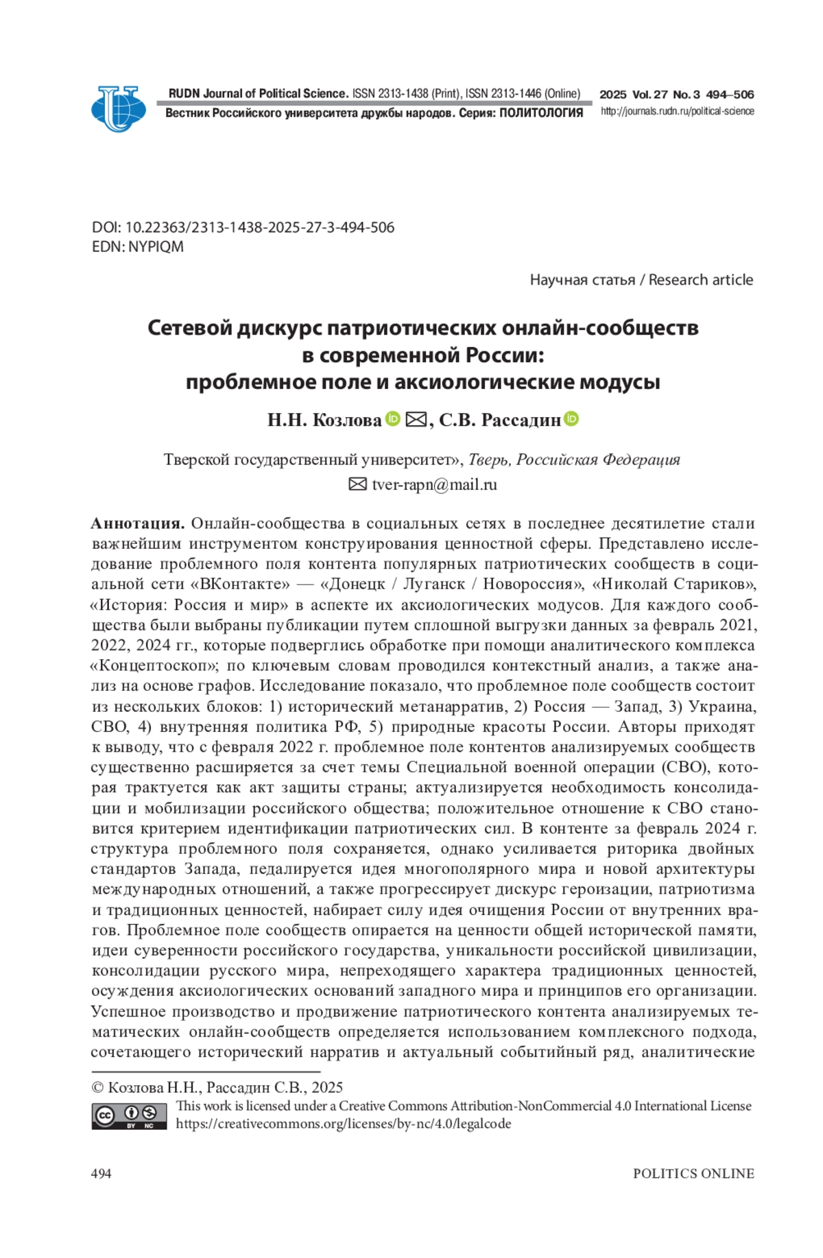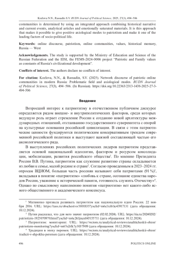 Онлайн-сообщества в социальных сетях в последнее десятилетие стали важнейшим инструментом конструирования ценностной сферы. Представлено исследование проблемного поля контента популярных патриотических сообществ в социальной сети «ВКонтакте» - «Донецк / Луганск / Новороссия», «Николай Стариков», «История: Россия и мир» в аспекте их аксиологических модусов. Для каждого сообщества были выбраны публикации путем сплошной выгрузки данных за февраль 2021, 2022, 2024 гг., которые подверглись обработке при помощи аналитического комплекса «Концептоскоп»; по ключевым словам проводился контекстный анализ, а также анализ на основе графов. Исследование показало, что проблемное поле сообществ состоит из нескольких блоков: 1) исторический метанарратив, 2) Россия - Запад, 3) Украина, СВО, 4) внутренняя политика РФ, 5) природные красоты России. Авторы приходят к выводу, что с февраля 2022 г. проблемное поле контентов анализируемых сообществ существенно расширяется за счет темы Специальной военной операции (СВО), которая трактуется как акт защиты страны; актуализируется необходимость консолидации и мобилизации российского общества; положительное отношение к СВО становится критерием идентификации патриотических сил. В контенте за февраль 2024 г. структура проблемного поля сохраняется, однако усиливается риторика двойных стандартов Запада, педалируется идея многополярного мира и новой архитектуры международных отношений, а также прогрессирует дискурс героизации, патриотизма и традиционных ценностей, набирает силу идея очищения России от внутренних врагов. Проблемное поле сообществ опирается на ценности общей исторической памяти, идеи суверенности российского государства, уникальности российской цивилизации, консолидации русского мира, непреходящего характера традиционных ценностей, осуждения аксиологических оснований западного мира и принципов его организации. Успешное производство и продвижение патриотического контента анализируемых тематических онлайн-сообществ определяется использованием комплексного подхода, сочетающего исторический нарратив и актуальный событийный ряд, аналитические статьи и эмоционально-насыщенные материалы. Именно данный подход позволяет придать позитивные аксиологические модусы патриотизму и сделать его одним из ведущих факторов общественно-политической жизни.