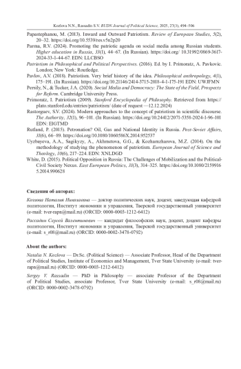 4. Мартынов М.Ю., Фадеева Л.А., Габеркорн А.И. Патриотизм как политический дискурс в современной России // Полис. Политические исследования. 2020. № 2. С. 109-121. DOI: 10.17976/jpps/2020.02.08 EDN: WUIELN