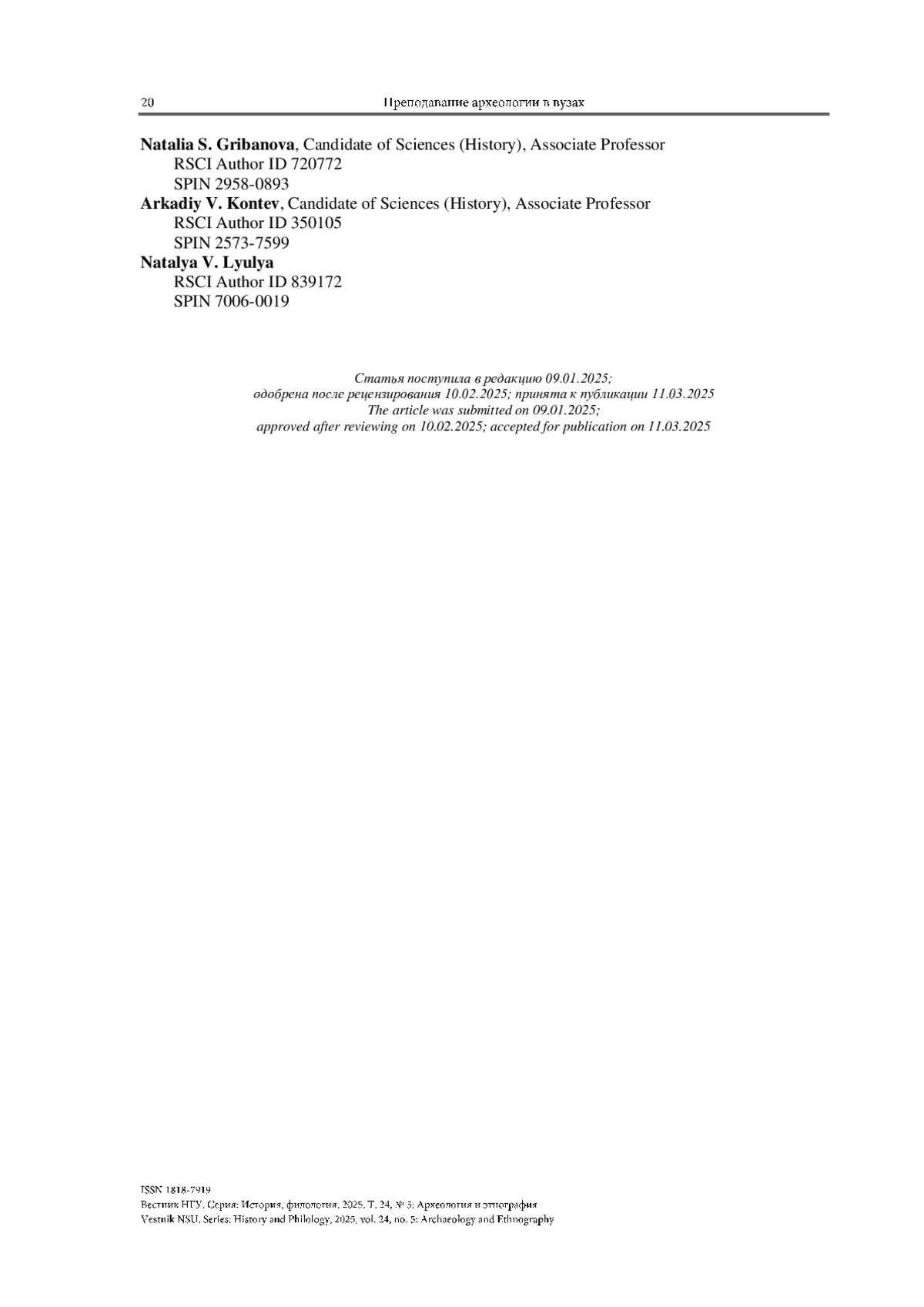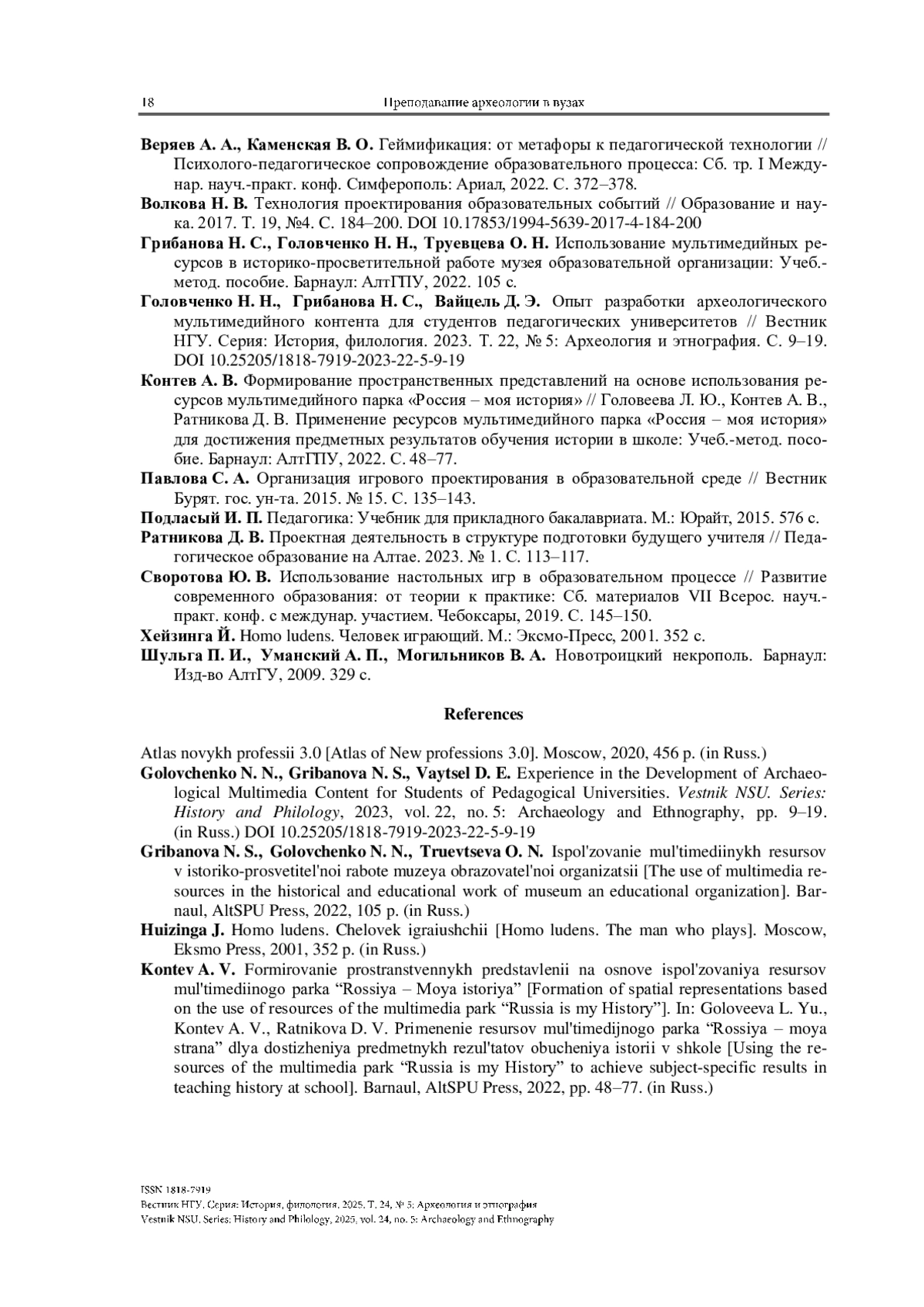 6. Головченко Н. Н., Грибанова Н. С., Вайцель Д. Э. Опыт разработки археологического мультимедийного контента для студентов педагогических университетов // Вестник НГУ. Серия: История, филология. 2023. Т. 22, № 5: Археология и этнография. С. 9-19. https://doi.org/10.25205/1818-7919-2023-22-5-9-19