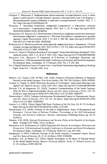 11. Никонов В.А., Воронов А.С., Сажина В.А., Володенков С.В., Рыбакова М.В. Цифровой суверенитет современного государства: содержание и структурные компоненты (по материалам экспертного исследования) // Вестник Томского государственного университета. Философия. Социология. Политология. 2021. № 60. С. 206-216. Х/60/18. DOI: 10.17223/1998863 EDN: PCWPLD