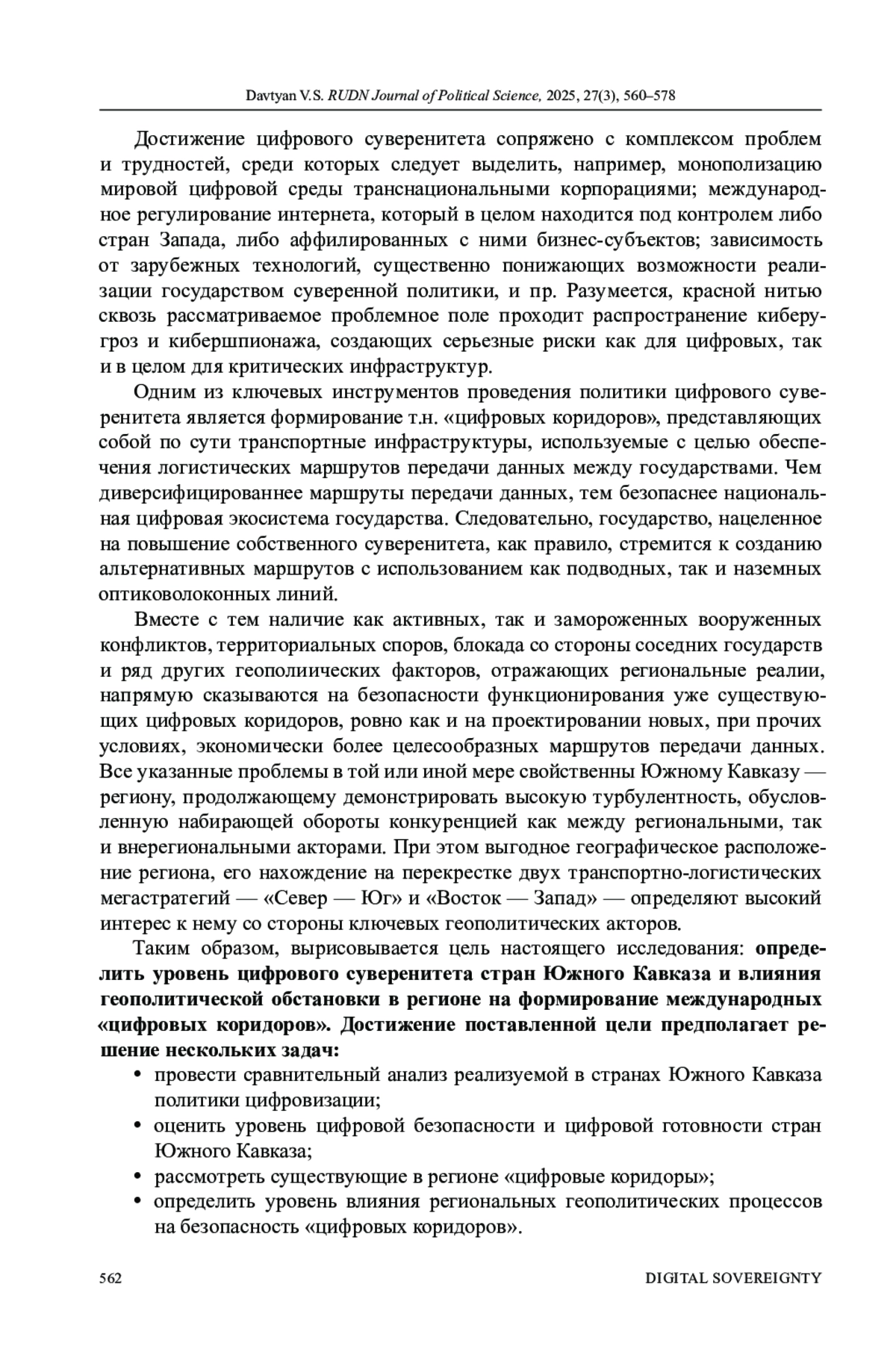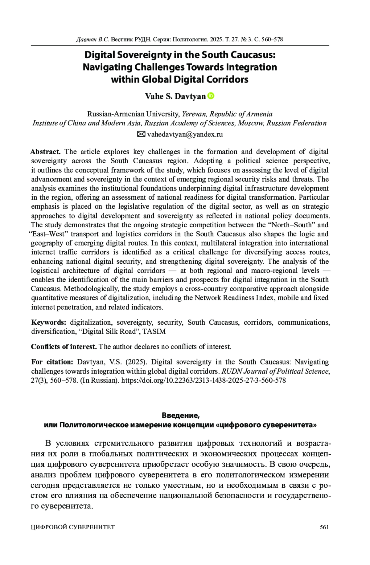 Страны Южного Кавказа в настоящее время находятся в стадии становления цифрового суверенитета. Изучение политологического измерения феномена цифрового суверенитета позволило установить концептуальные рамки исследования, сводящиеся к определению уровня цифрового развития и суверенитета южно кавказских стран в условиях новых рисков и угроз региональной безопасности. Изучение институциональных основ развития цифровых инфраструктур в странах Южного Кавказа дало возможность оценить уроень их готовности к осуществлению цифровой трансформации. В этой связи особое внимание уделено вопросам законодательного регулирования цифровой отрасли. Выявлены стратегические подходы стран региона к перспективам цифрового развития и суверенитета, отраженные в официальных стратегических документах. Показано, что проистекающая на Южном Кавказе ожесточенная конкуренция между двумя ключевыми транспортно-логистическими стратегиями «Север - Юг» и «Восток - Запад» сказывается также на логике и географии проложения цифровых коридоров. В частности, многосторонняя интеграция в телекоммуникационные коридоры интернет-трафика рассматриваются нами в качестве ключевого вызова диверсификации путей обеспечения национальной цифровой безопасности и повышения цифрового суверенитета стран региона. В этой связи анализ логистической архитектуры цифровых коридоров на двух уровнях - региональном и макрорегиональном - позволил определить основные проблемы и перспективы цифровой интеграции на Южном Кавказе. Методология работы включает межстрановой сравнительный анализ, а также методы количественной оценки уровня цифровизации (индекс сетевой готовности, проникновение мобильного и фиксированного интернета и пр.).