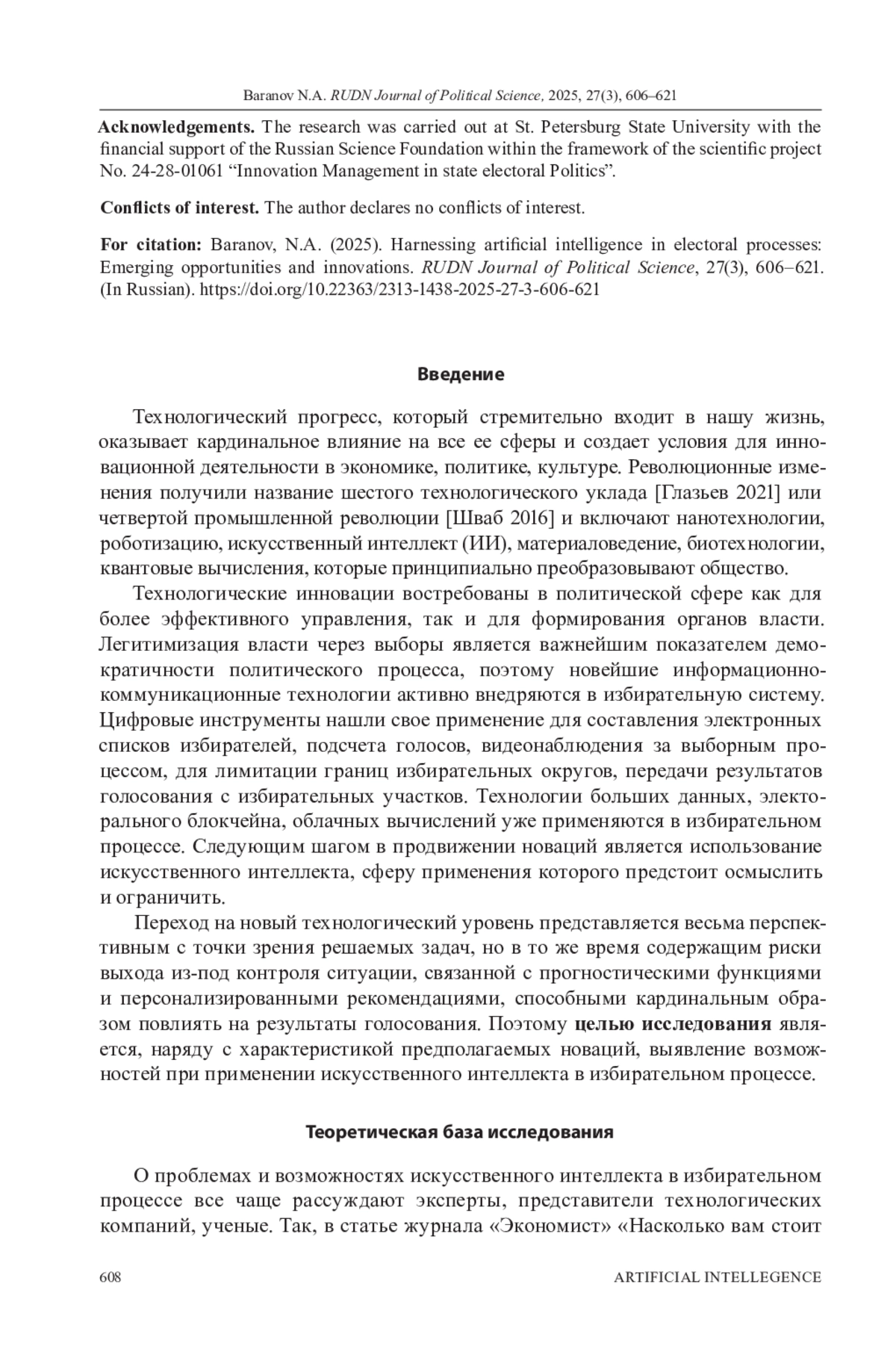 11. Тертышный В.А. Интеграция искусственного интеллекта в избирательный процесс как глобальный тренд: правовой аспект // Интеллектуальные ресурсы - региональному развитию. 2024. № 1. С. 154-160. EDN: BGHTMQ