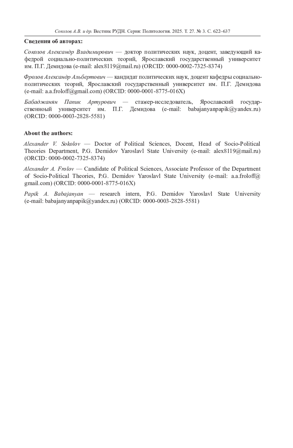 Аффективная политическая поляризация комплексно рассматривается в сочетании ее эмоциональных, поведенческих и когнитивных аспектов. Все они проявляются в различиях между отношением индивида к политическим единомышленникам (ингруппе) и оппонентам (аутгруппе): в испытываемых эмоциях, готовности к сотрудничеству, склонности приписывать положительные или отрицательные качества. Особое внимание уделено проблеме различий между интенсивностью проявлений аффективной политической поляризации в онлайн-среде по сравнению с традиционными формами коммуникации. Большинство современных исследователей склоняются к гипотезе о более высоком уровне поляризации в рамках онлайн-взаимодействий. Данная гипотеза опирается на свойства интернет-общения, которые облегчают пользователю управление сетью контактов и источников информации и порождают феномены «эхо-камер» и «пузырей фильтров». Последние способствуют психологическому восприятию точки зрения единомышленников как единственно «нормальной» и увеличению эмоциональной дистанции по отношению к политическим оппонентам. При этом эмпирические свидетельства в пользу этого механизма довольно ограничены; крайне мало исследований, которые ставили бы задачу прямого сравнения аффективной поляризации в цифровой и традиционной средах. Эта задача решается авторами на основе опросных данных, собранных в 2025 г. среди российских респондентов. Все ключевые индикаторы аффективной поляризации измеряются для двух ситуаций - онлайн и офлайн, что обеспечивает возможность их непосредственного сопоставления. С опорой на предыдущие исследования в качестве ключевого поляризующего признака рассматривается отношение к руководству страны. Данные проанализированы с помощью корреляционного и регрессионного анализа, а также методом главных компонент. Анализ показывает, что аффективная поляризация демонстрирует в целом высокую согласованность в физическом мире и в социальных сетях. Результаты регрессии не позволяют выявить существенные расхождения в уровнях и факторах, влияющих на аффективную поляризацию, в двух средах.