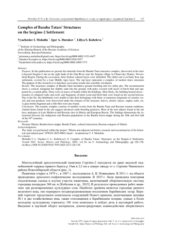 Представлена публикация материалов комплекса сооружений барабинских татар, состоящего из наземного жилища и двух хозяйственных ям. Памятник обнаружен на территории городища эпохи раннего железа Сергино-2; расположенного на правом берегу р. Оми у с. Сергино Чановского района Новосибирской области. Жилище представляет собой летнюю постройку в виде покрытого берестой и дерном шалаша. Найдены железные ножи; долото; скальпель; гвозди; фрагмент стеклянного флакона и ружейный кремень. Основная часть этих предметов имеет широкий круг аналогий в позднесредневековых и русских памятниках Сибири и европейской части России. Керамический комплекс памятника состоит из лепных сосудов барабинских татар и русской станковой керамики. Кости животных от остатков пищи указывают на развитое скотоводство. Памятник демонстрирует взаимодействие аборигенного и русского населения Барабинской лесостепи в XVIII – первой половине XIX в.