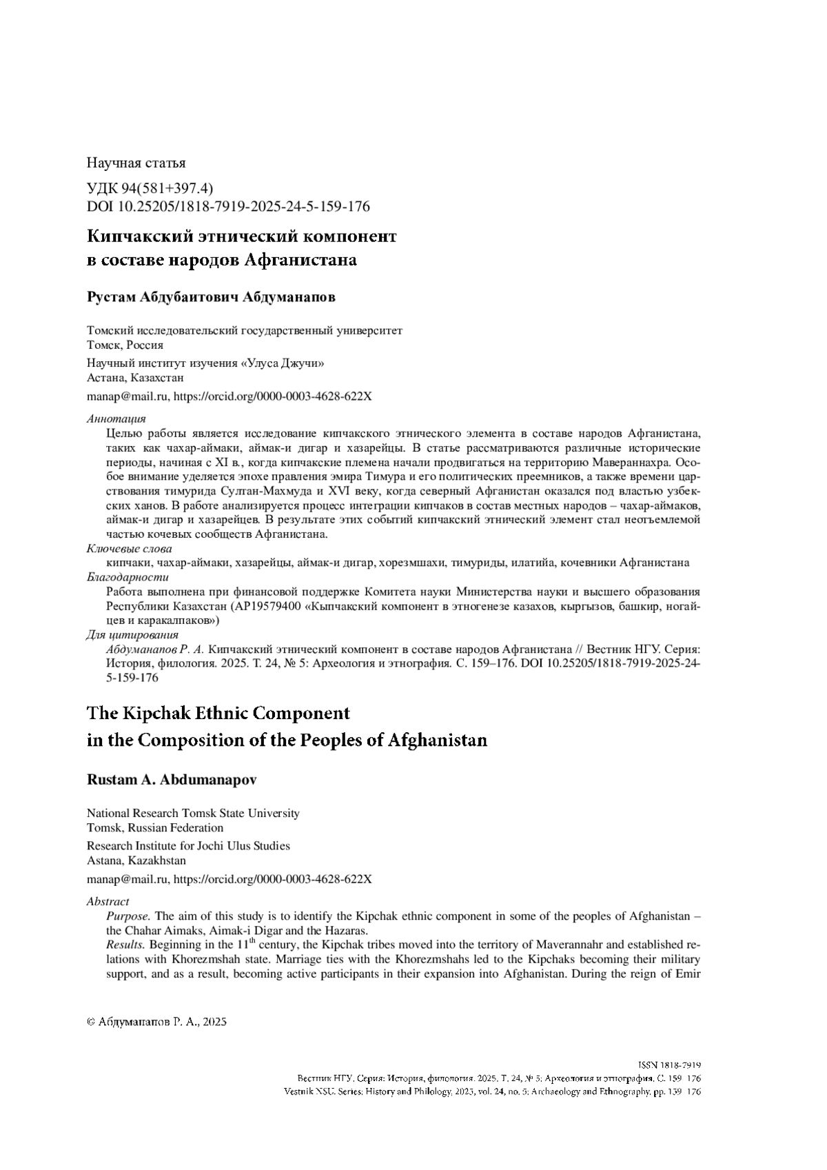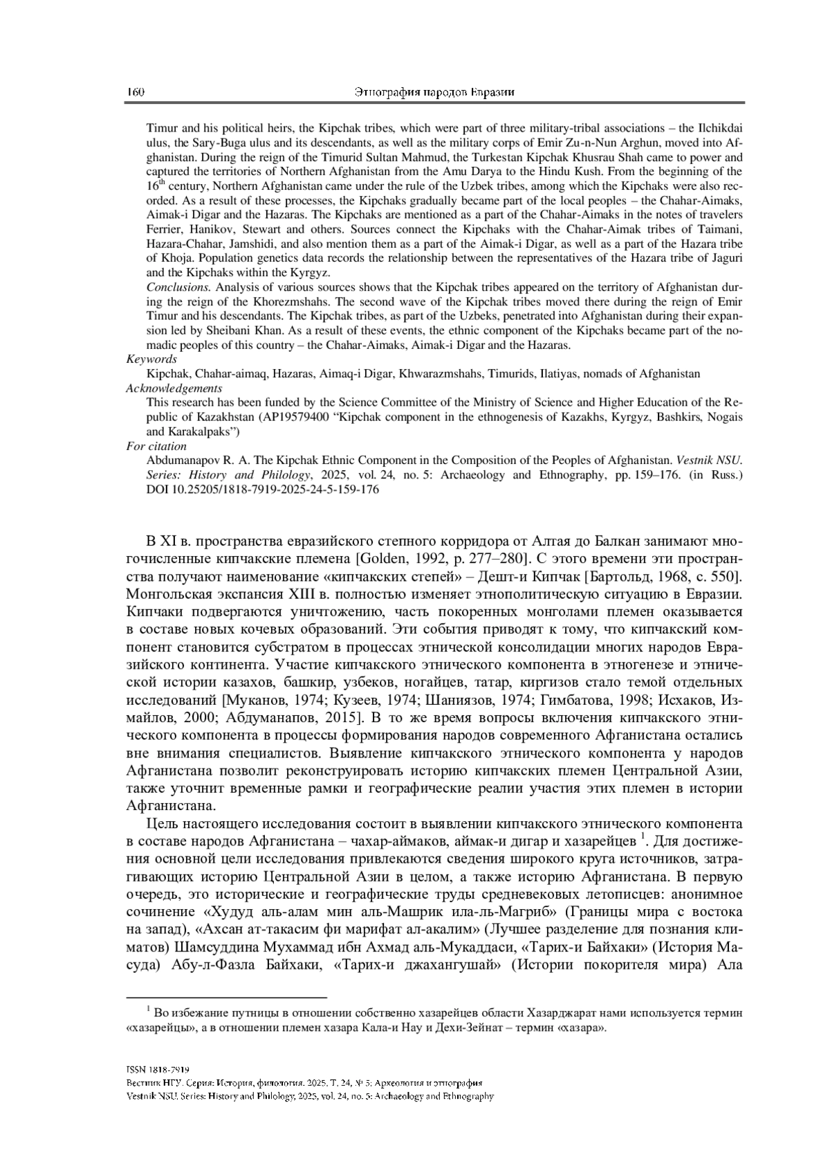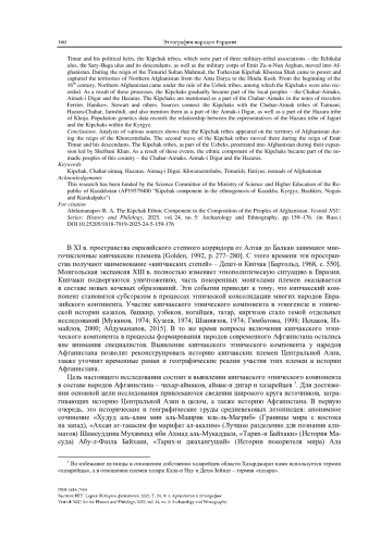 Целью работы является исследование кипчакского этнического элемента в составе народов Афганистана, таких как чахар-аймаки, аймак-и дигар и хазарейцы. В статье рассматриваются различные исторические периоды, начиная с XI в., когда кипчакские племена начали продвигаться на территорию Мавераннахра. Особое внимание уделяется эпохе правления эмира Тимура и его политических преемников, а также времени царствования тимурида Султан-Махмуда и XVI веку, когда северный Афганистан оказался под властью узбекских ханов. В работе анализируется процесс интеграции кипчаков в состав местных народов – чахар-аймаков, аймак-и дигар и хазарейцев. В результате этих событий кипчакский этнический элемент стал неотъемлемой частью кочевых сообществ Афганистана.