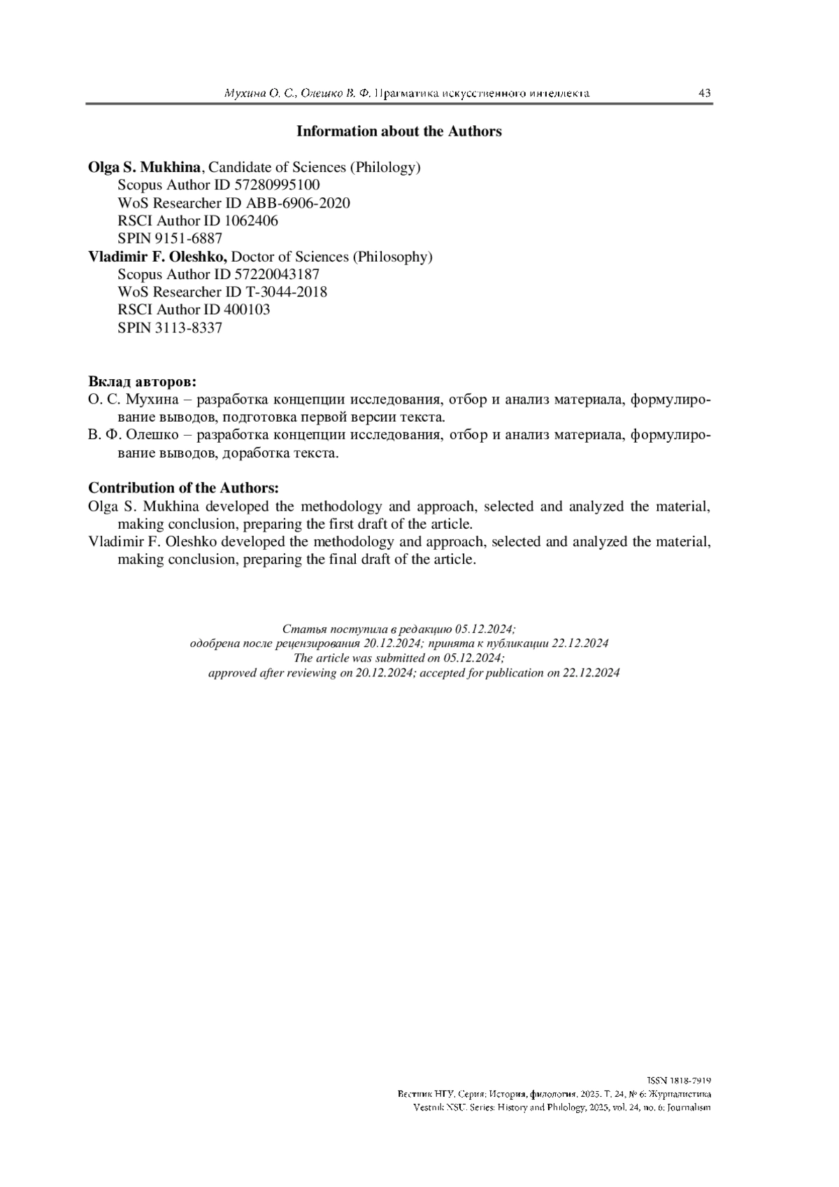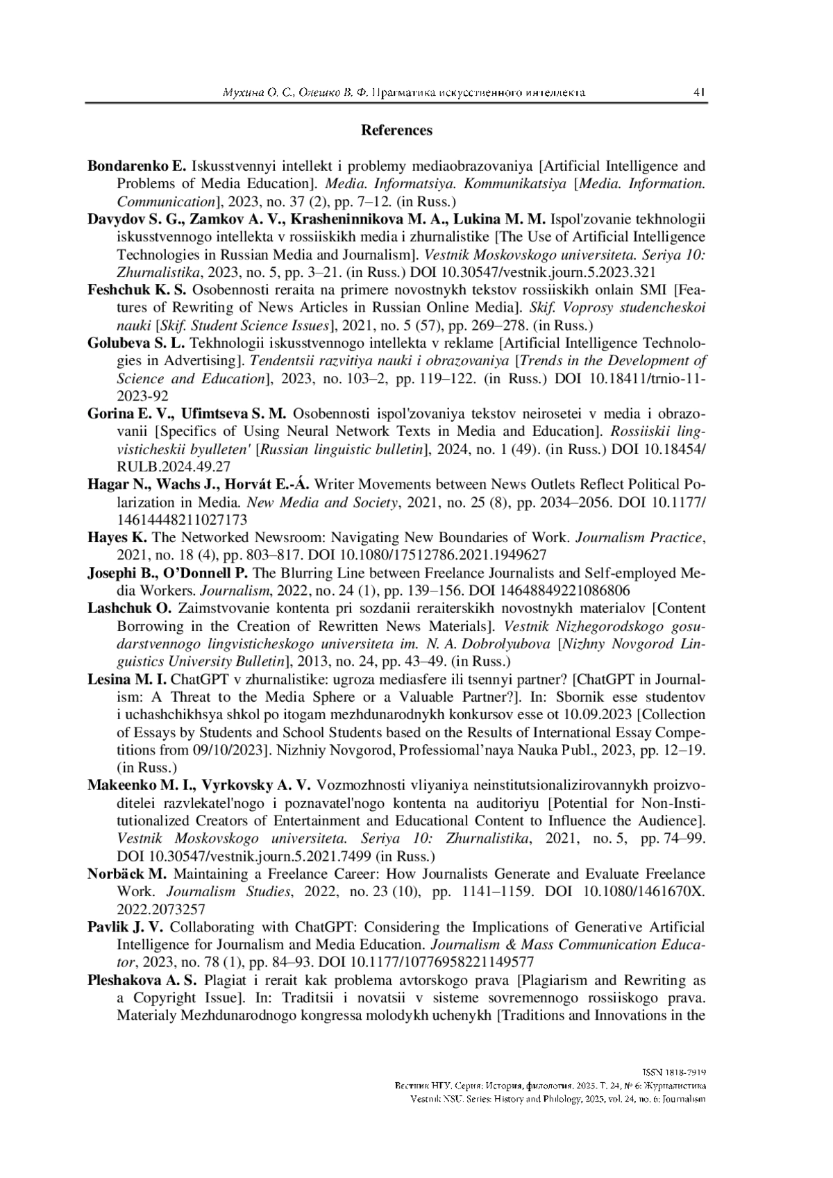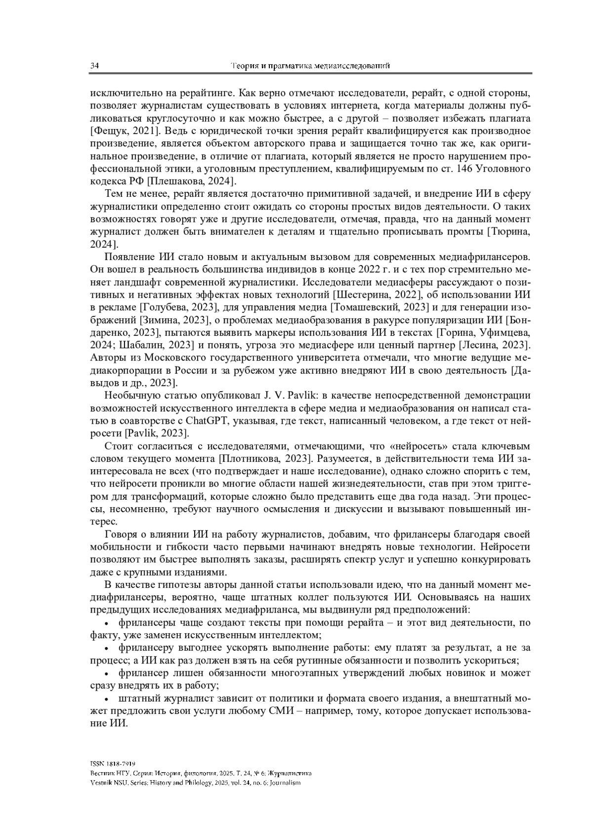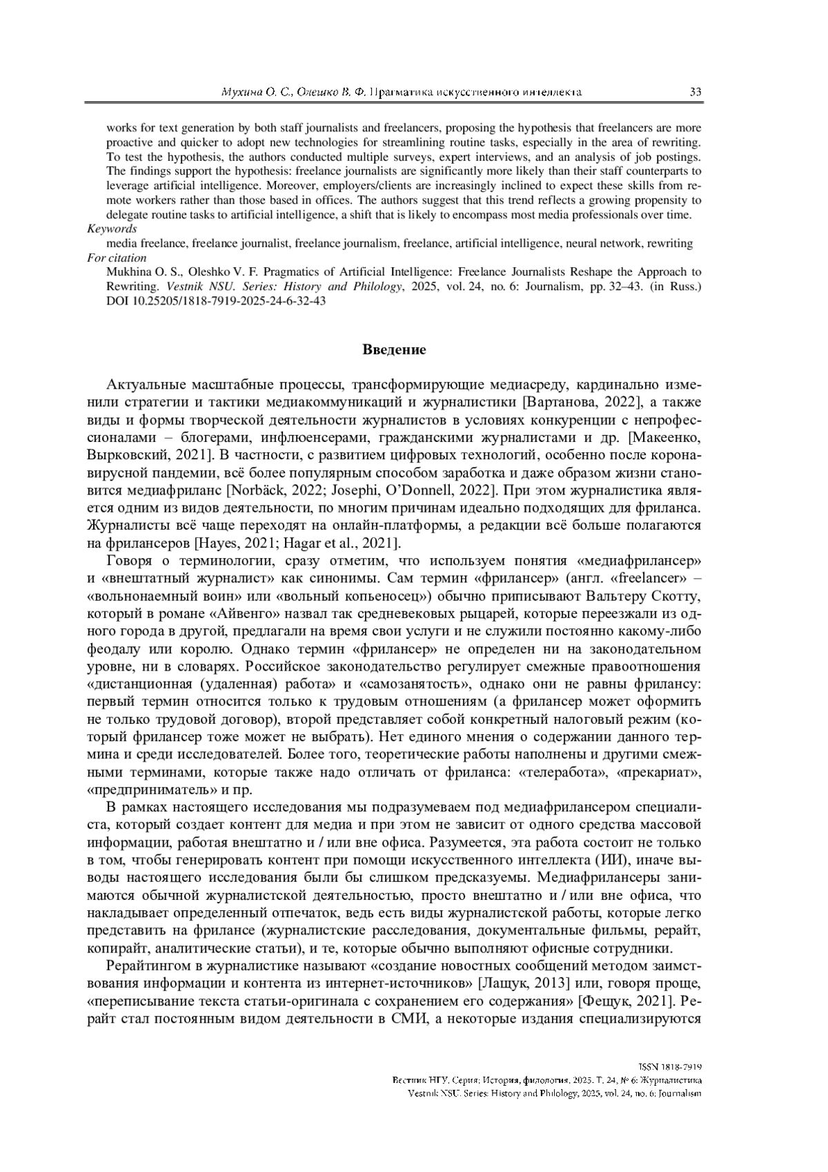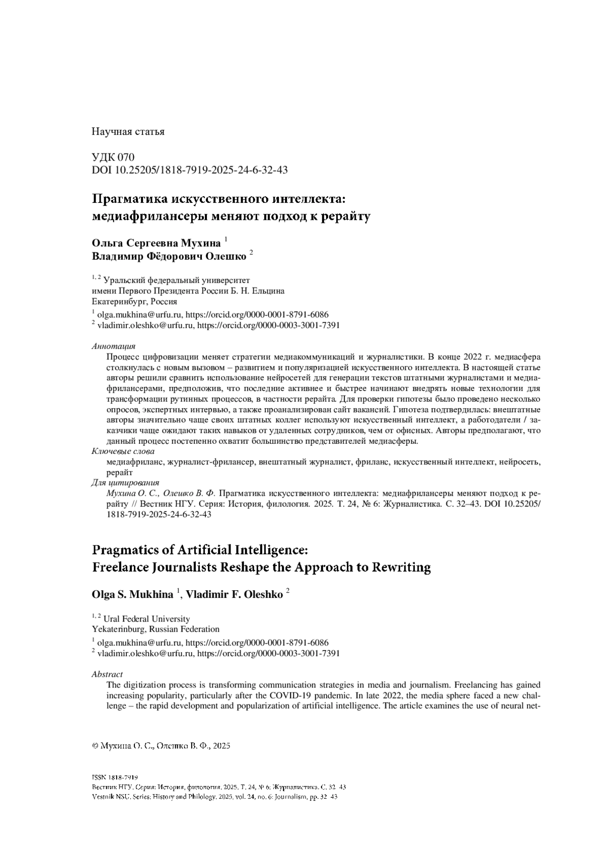 МУХИНА О. С., ОЛЕШКО В. Ф. ПРАГМАТИКА ИСКУССТВЕННОГО ИНТЕЛЛЕКТА: МЕДИАФРИЛАНСЕРЫ МЕНЯЮТ ПОДХОД К РЕРАЙТУ // ВЕСТНИК НГУ. СЕРИЯ: ИСТОРИЯ, ФИЛОЛОГИЯ. 2025. ТОМ 24, № 6