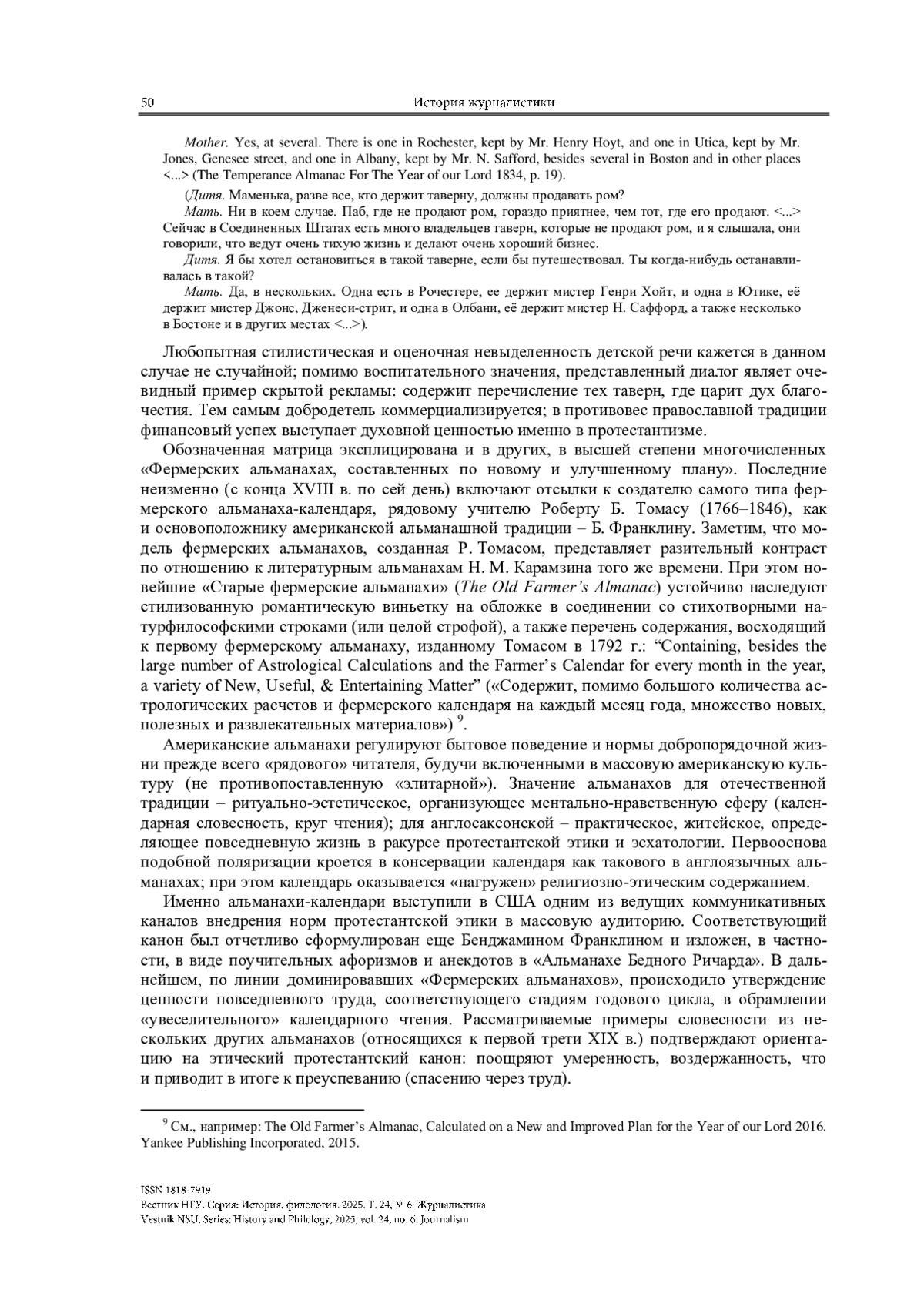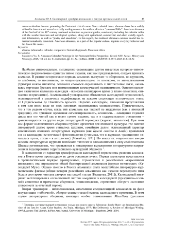 Универсальный тип средневековых альманахов-календарей, измеряющих временные отрезки и обладающих прогностическими функциями, исторически образует две основные транснациональные модели. Первая представлена сначала франко-германскими, а затем, в наиболее последовательном воплощении, российскими литературными «карманными книжками», где связь с календарем эксплицирована поэтологически. Вторая модель – англосаксонская, в более выраженном варианте унаследовавшая функциональный календарный прообраз, имплементирует его в практическом, религиозно-моральном отношении. По отношению к альманахам (российским, американским), ориентированным на европейский образец, утверждение самого альманашного типа совпало с эпохой романтизма. На примере отдельных, преимущественно серийных, американских альманахов, хронологически относящихся к романтической поре, рассматривается тип альманаха как коммуникативного канала распространения ценностей протестантской этики.