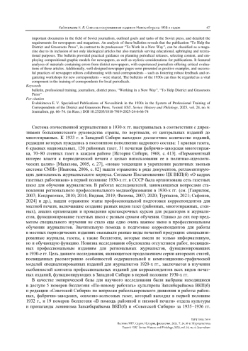 Статья посвящена рассмотрению особенностей профессиональных изданий для корреспондентов районной и низовой печати 1930-х гг. Анализ контента бюллетеней «По-новому работать» и «В помощь районной и низовой печати» позволил автору статьи выявить общие и отличительные признаки изданий. Содержание бюллетеня «В помощь районной и низовой печати», ориентированное не только на информирование, но и на обучение журналистов местных газет, позволяет автору данной статьи рассматривать бюллетень в качестве специализированного профессионального издания, соответствующего журнальному типу. В результате исследования автор приходит к выводу о значительной роли издания «В помощь районной и низовой печати» в системе становления регионального профессионального образования журналистов.