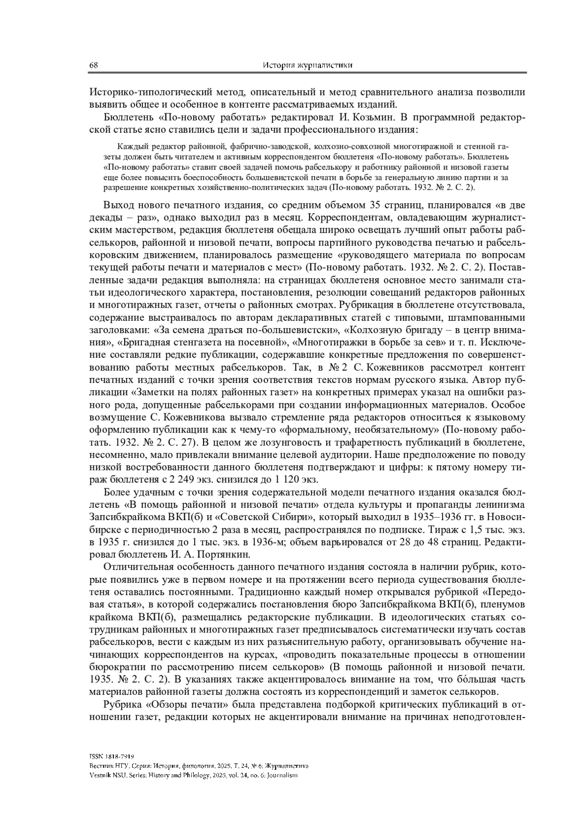 Система отечественной журналистики в 1930-х гг. выстраивалась в соответствии с директивами большевистского руководства страны, по вертикали, от центральных изданий до многотиражных. К 1933 г. в Западной Сибири выходило достаточное количество изданий, редакции которых нуждались в постоянном пополнении кадрового состава: 1 краевая газета, 6 краевых национальных, 120 районных газет, 31 печатная фабрично-заводская многотиражка, 70–80 стенных газет в каждом районе [История Сибири, 1968, с. 413].