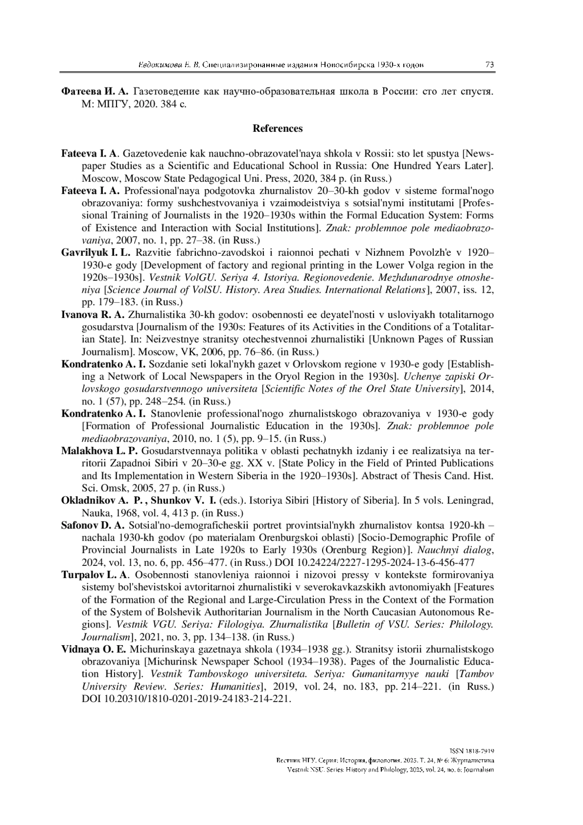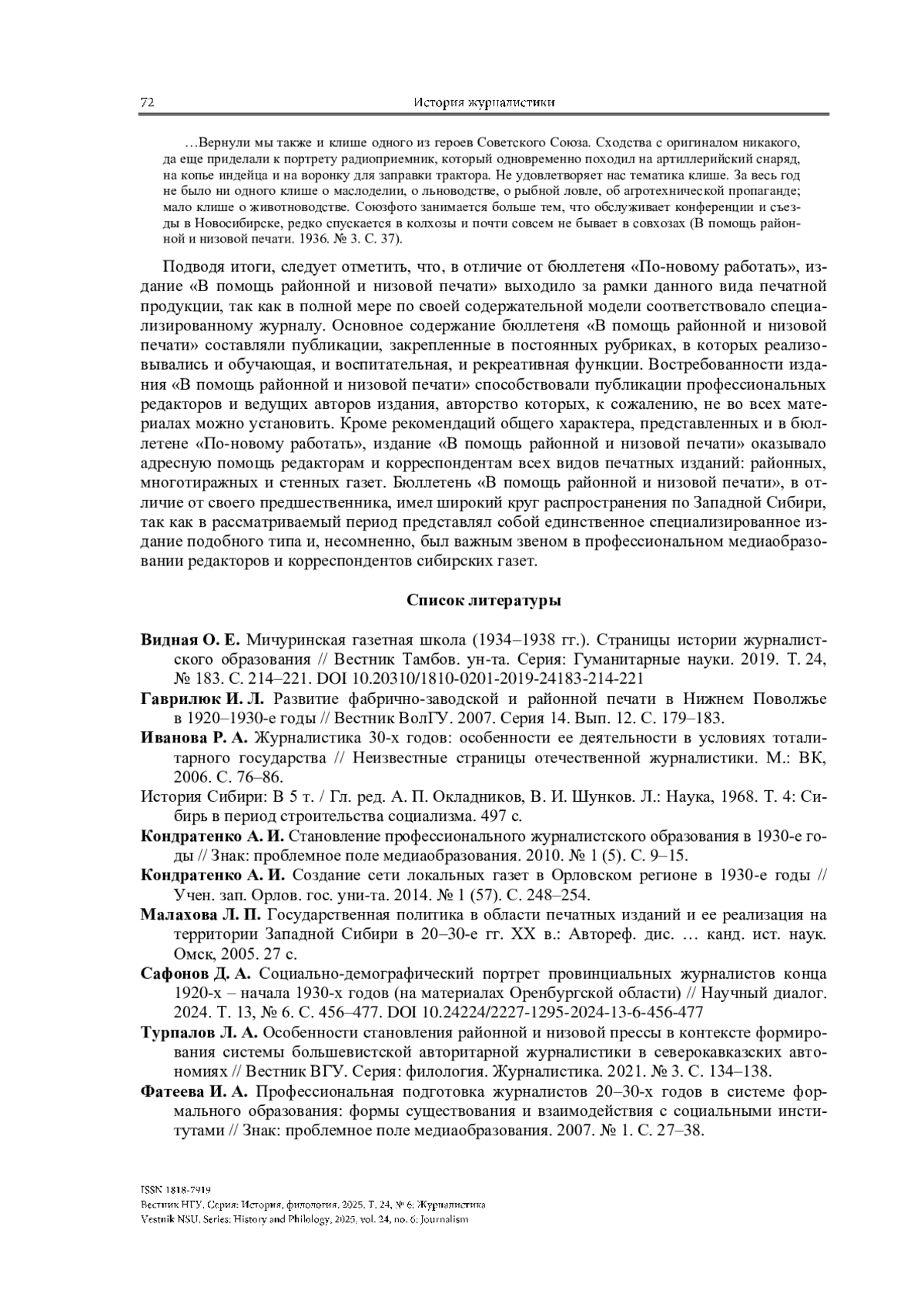 9. Турпалов Л. А. Особенности становления районной и низовой прессы в контексте формирования системы большевистской авторитарной журналистики в северокавказских авто- номиях // Вестник ВГУ. Серия: филология. Журналистика. 2021. № 3. С. 134-138. Фатеева И. А. Профессиональная подготовка журналистов 20-30-х годов в системе формального образования: формы существования и взаимодействия с социальными институтами // Знак: проблемное поле медиаобразования. 2007. № 1. С. 27-38.