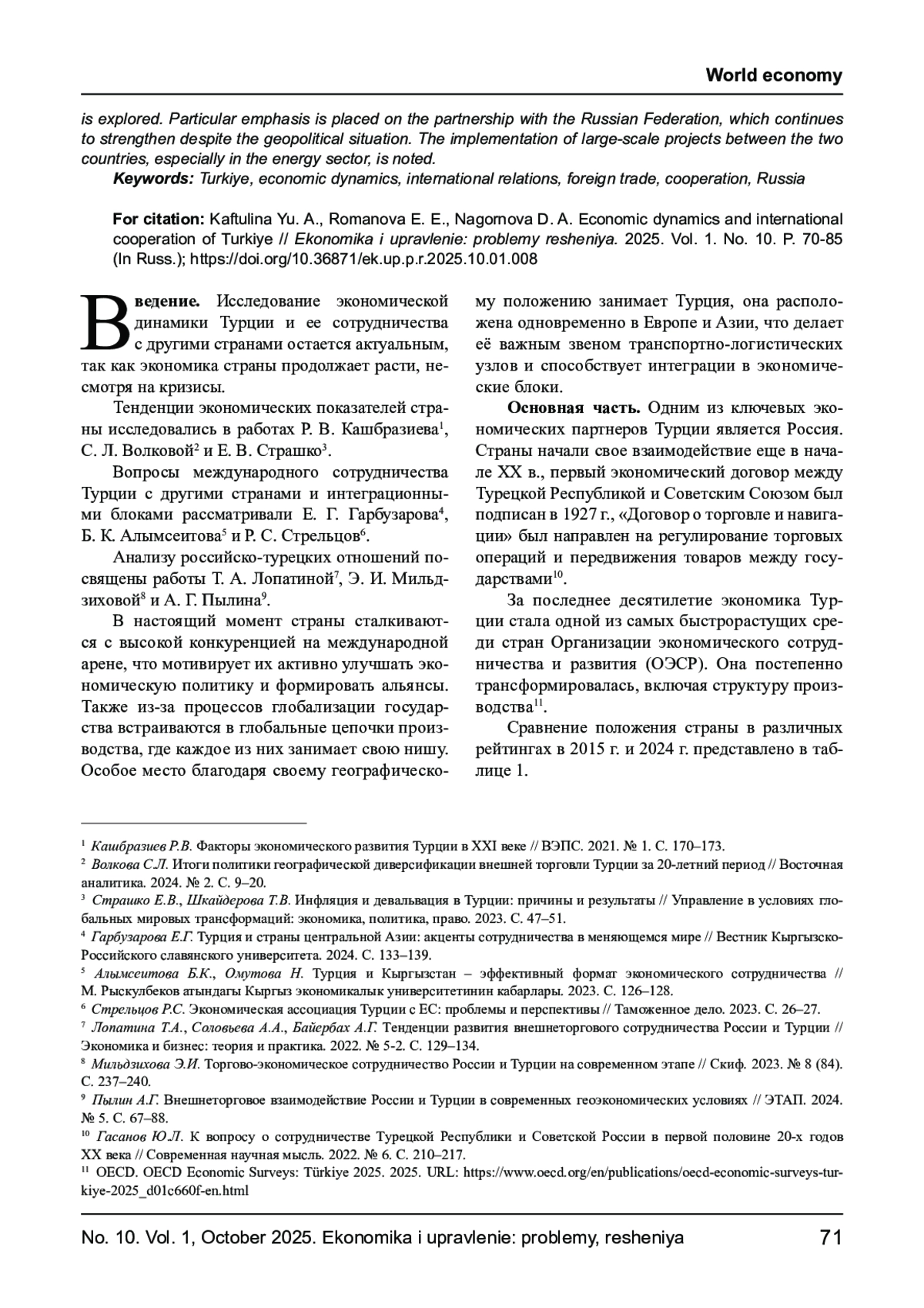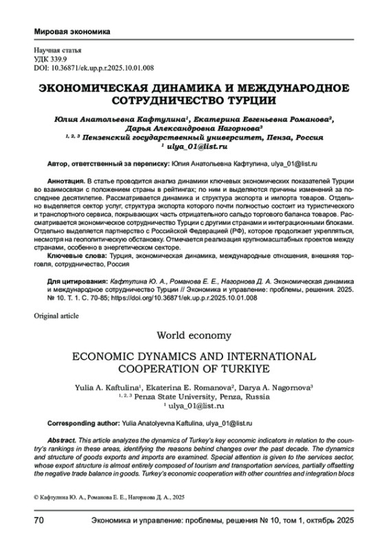 В статье проводится анализ динамики ключевых экономических показателей Турции во взаимосвязи с положением страны в рейтингах; по ним и выделяются причины изменений за последнее десятилетие. Рассматривается динамика и структура экспорта и импорта товаров. Отдельно выделяется сектор услуг, структура экспорта которого почти полностью состоит из туристического и транспортного сервиса, покрывающих часть отрицательного сальдо торгового баланса товаров. Рассматривается экономическое сотрудничество Турции с другими странами и интеграционными блоками. Отдельно выделяется партнерство с Российской Федерацией (РФ), которое продолжает укрепляться, несмотря на геополитическую обстановку. Отмечается реализация крупномасштабных проектов между странами, особенно в энергетическом секторе.