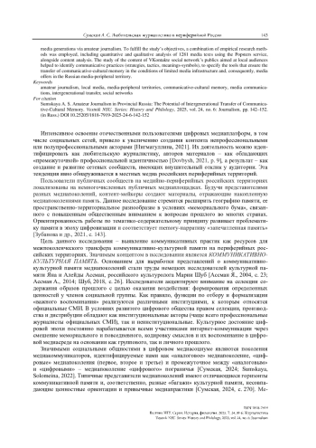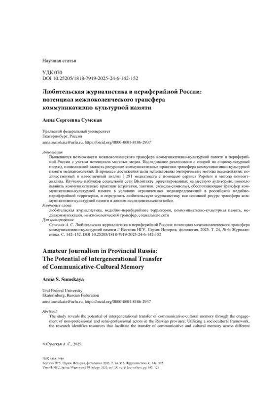 Выявляются возможности межпоколенческого трансфера коммуникативно-культурной памяти в периферийной России с учетом потенциала местных медиа. Исследование реализовано с опорой на социокультурный подход, позволивший выявить ресурсные коммуникативные практики трансфера коммуникативно-культурной памяти медиапоколений. В процессе достижения цели использованы эмпирические методы исследования: количественный и качественный анализ 1 281 медиатекста с помощью сервиса Popsters и метода контентанализа. Изучение пабликов социальной сети ВКонтакте, ориентированных на местную аудиторию, помогло выявить коммуникативные практики (стратегии, тактики, смыслы-символы), обеспечивающие трансфер коммуникативно-культурной памяти в условиях ограниченных медиапредложений российской медийно-периферийной территории, и определить любительскую журналистику как основной ресурс трансфера коммуникативно-культурной памяти в данном исследовательском кейсе.