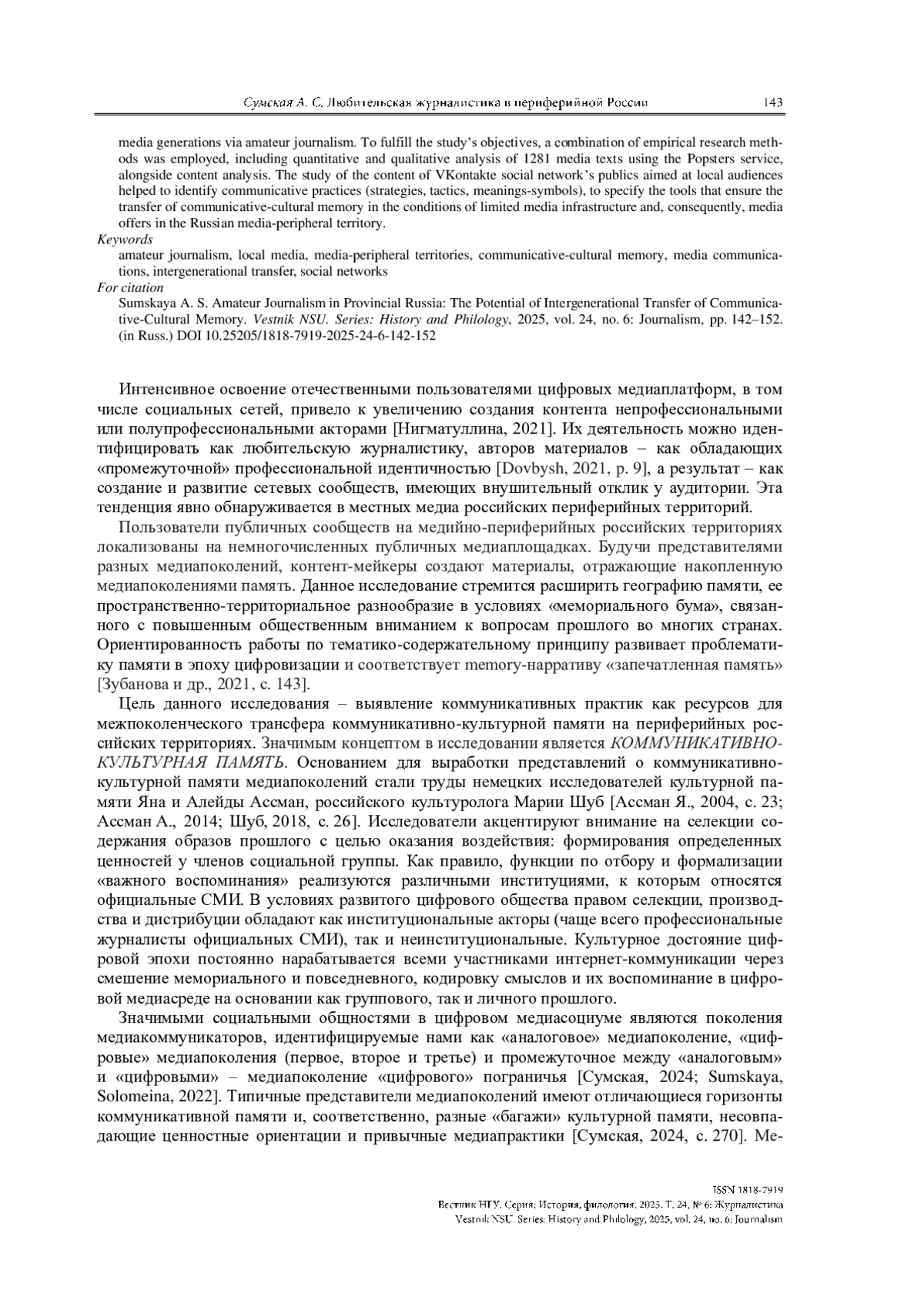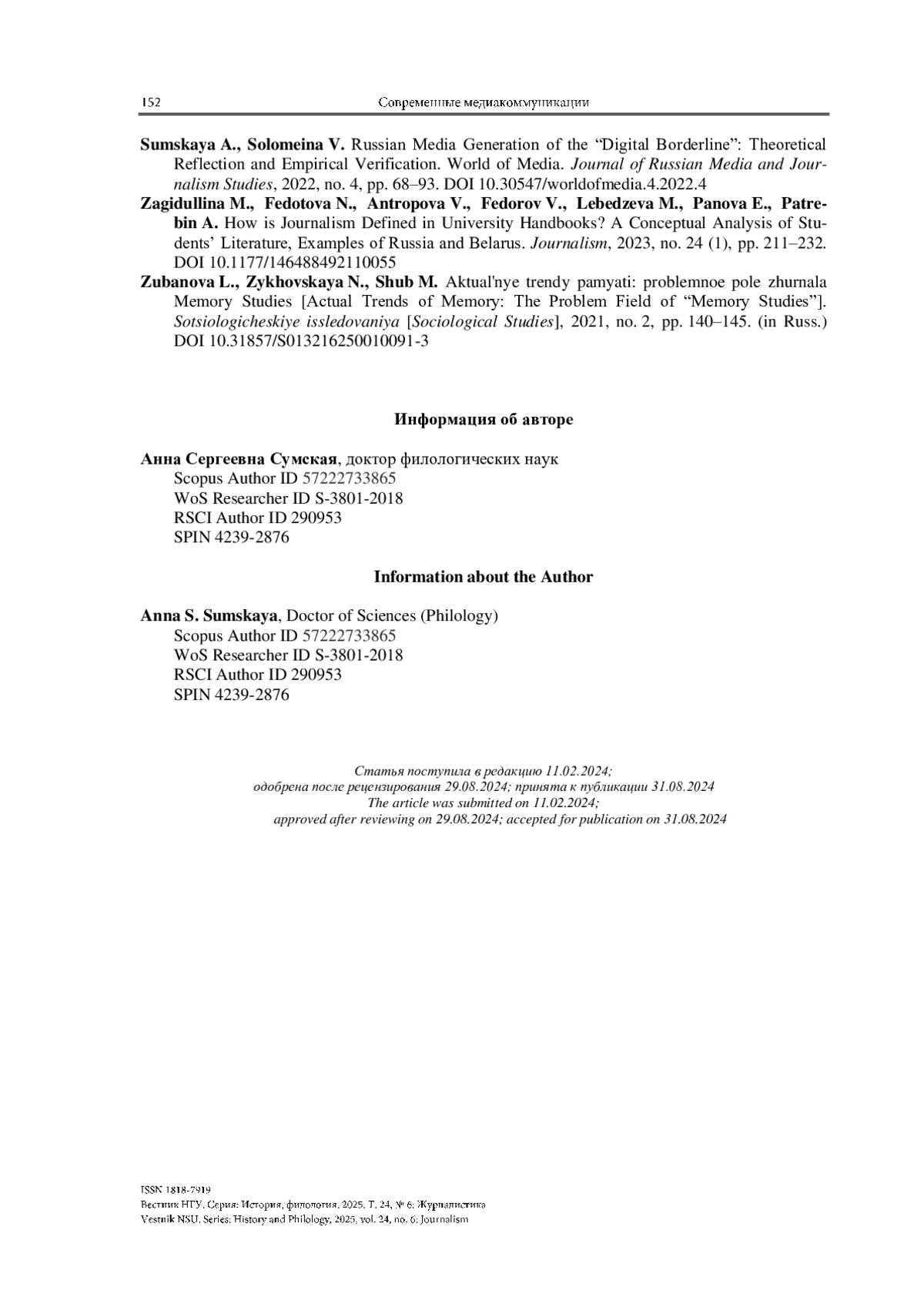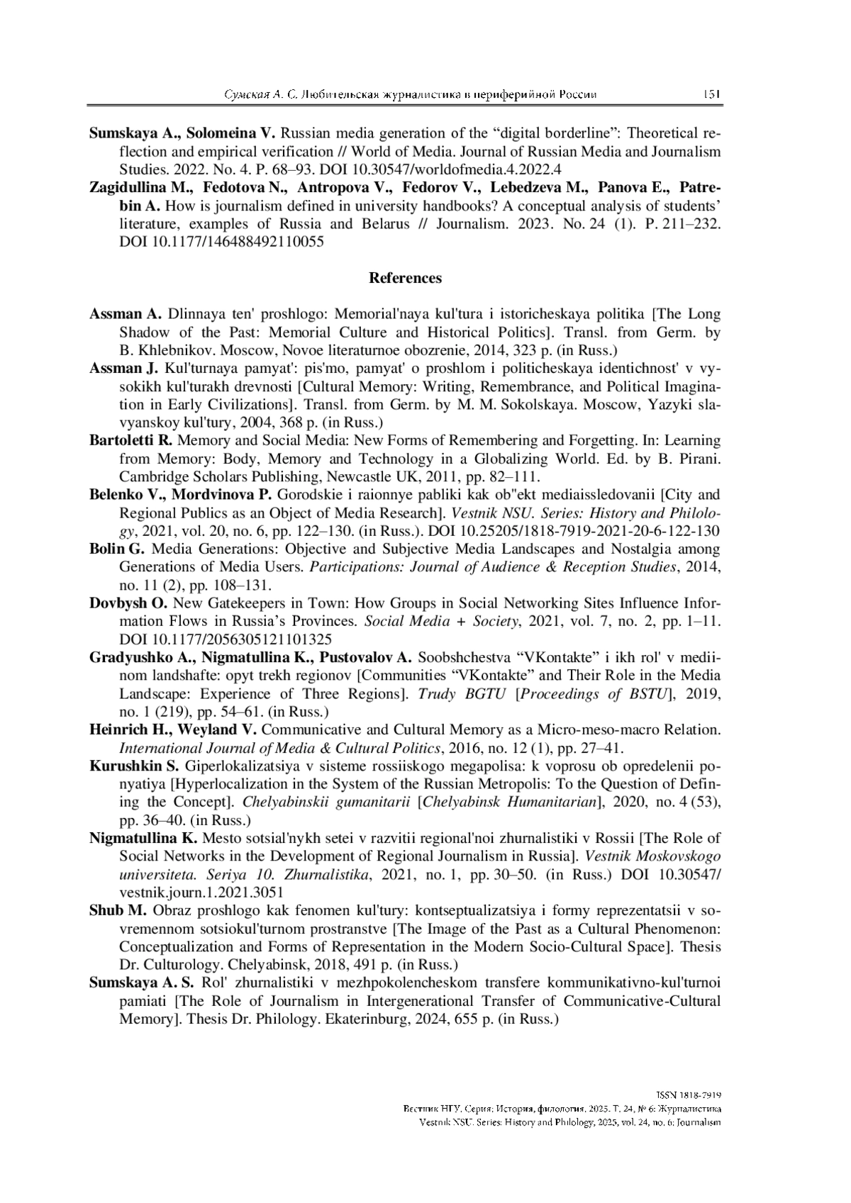 8. Сумская А. С. Роль журналистики в межпоколенческом трансфере коммуникативно-культурной памяти: Дис. ... д-ра филол. наук. Екатеринбург, 2024. 655 с.