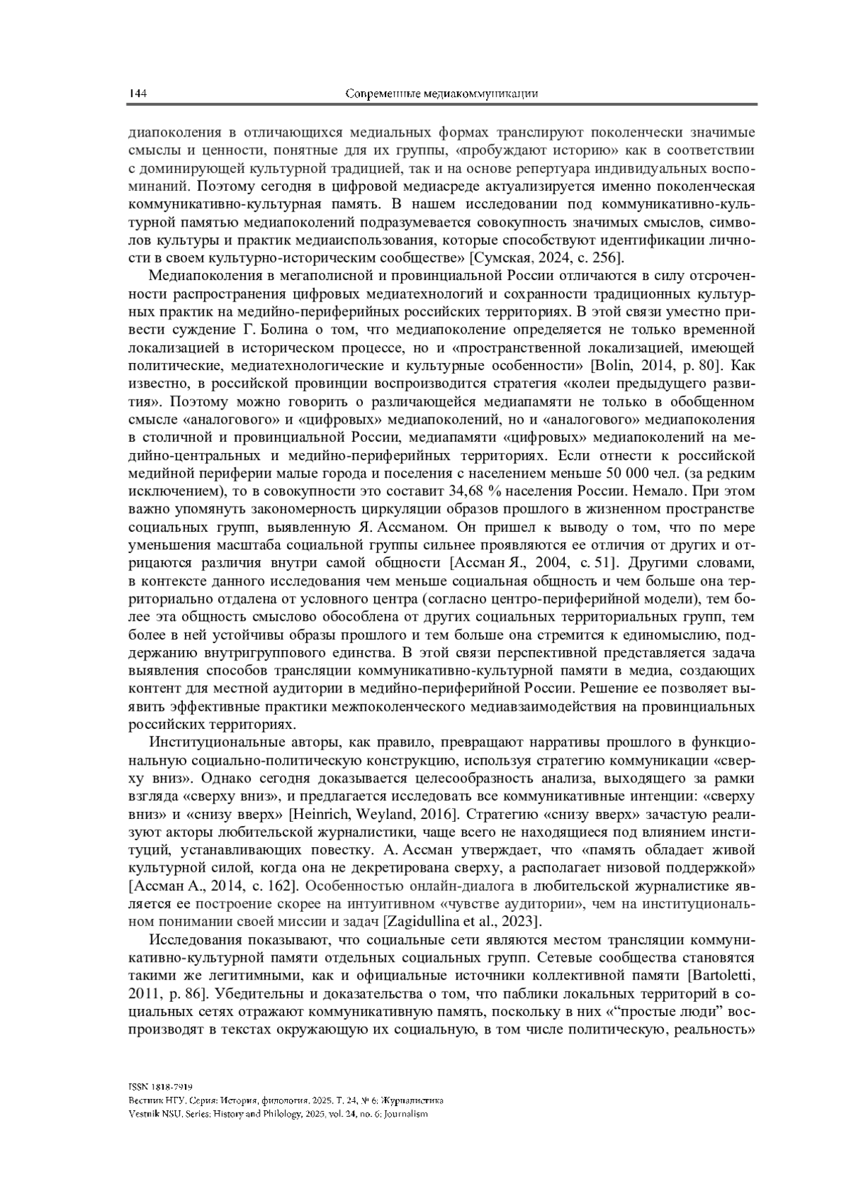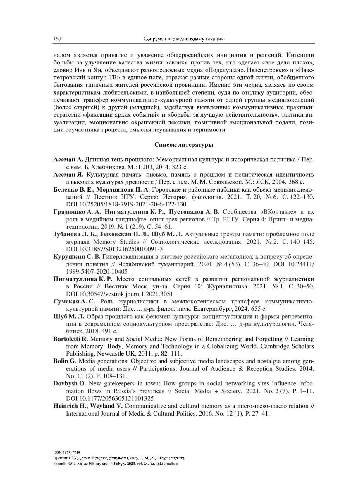 5. Зубанова Л. Б., Зыховская Н. Л., Шуб М. Л. Актуальные тренды памяти: проблемное поле журнала Memory Studies // Социологические исследования. 2021. № 2. С. 140-145. https://doi.org/10.31857/S013216250010091-3