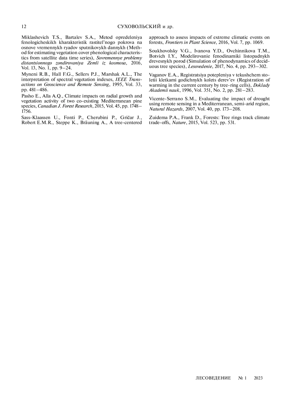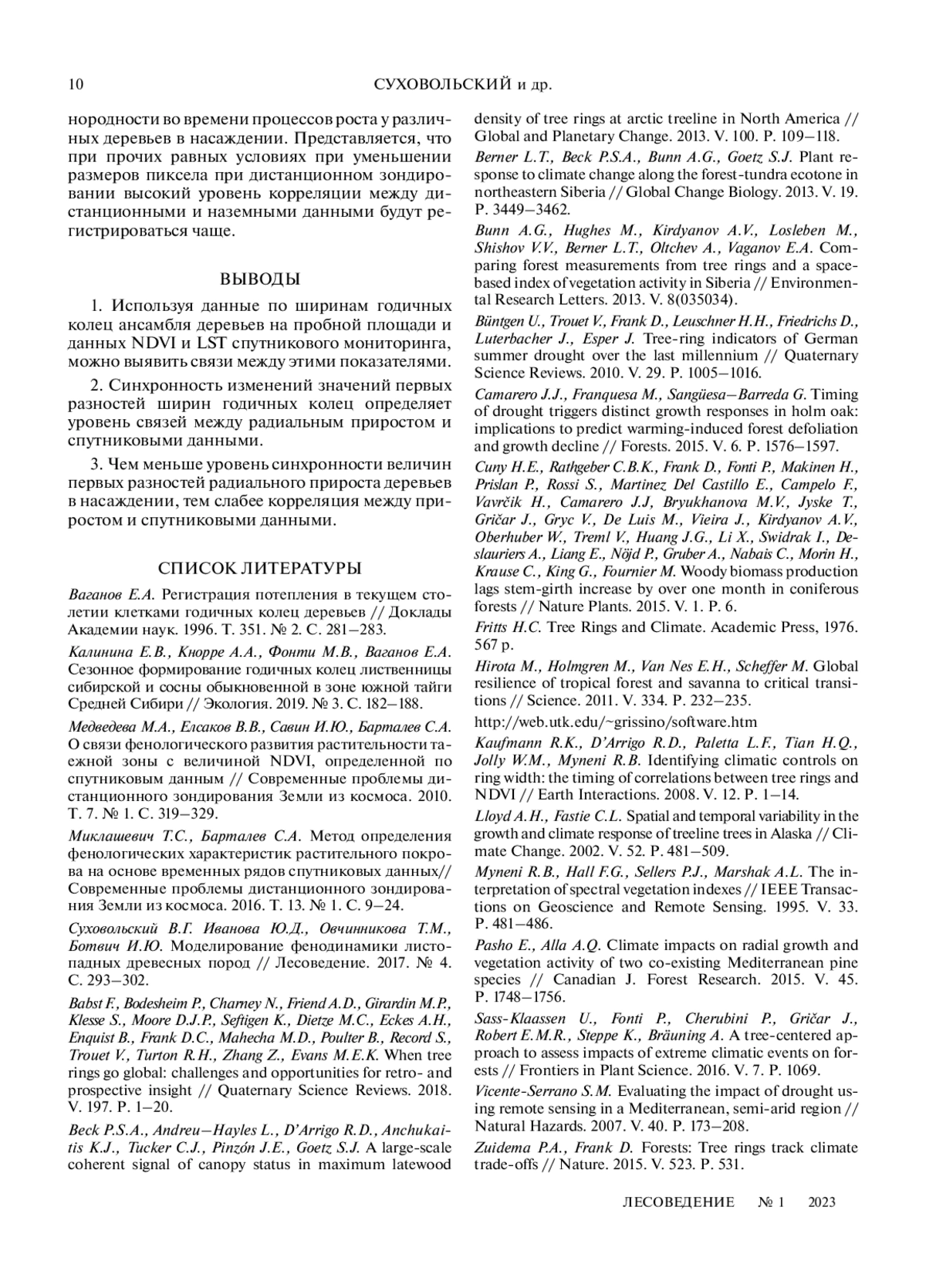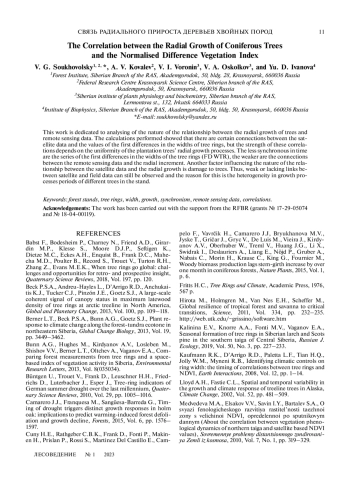 СУХОВОЛЬСКИЙ В. Г., КОВАЛЕВ А. В., ВОРОНИН В. И., ОСКОЛКОВ В. А., ИВАНОВА Ю. Д. СВЯЗЬ РАДИАЛЬНОГО ПРИРОСТА ДЕРЕВЬЕВ ХВОЙНЫХ ПОРОД И НОРМАЛИЗОВАННОГО РАЗНОСТНОГО ВЕГЕТАЦИОННОГО ИНДЕКСА // ЛЕСОВЕДЕНИЕ. 2023. № 1