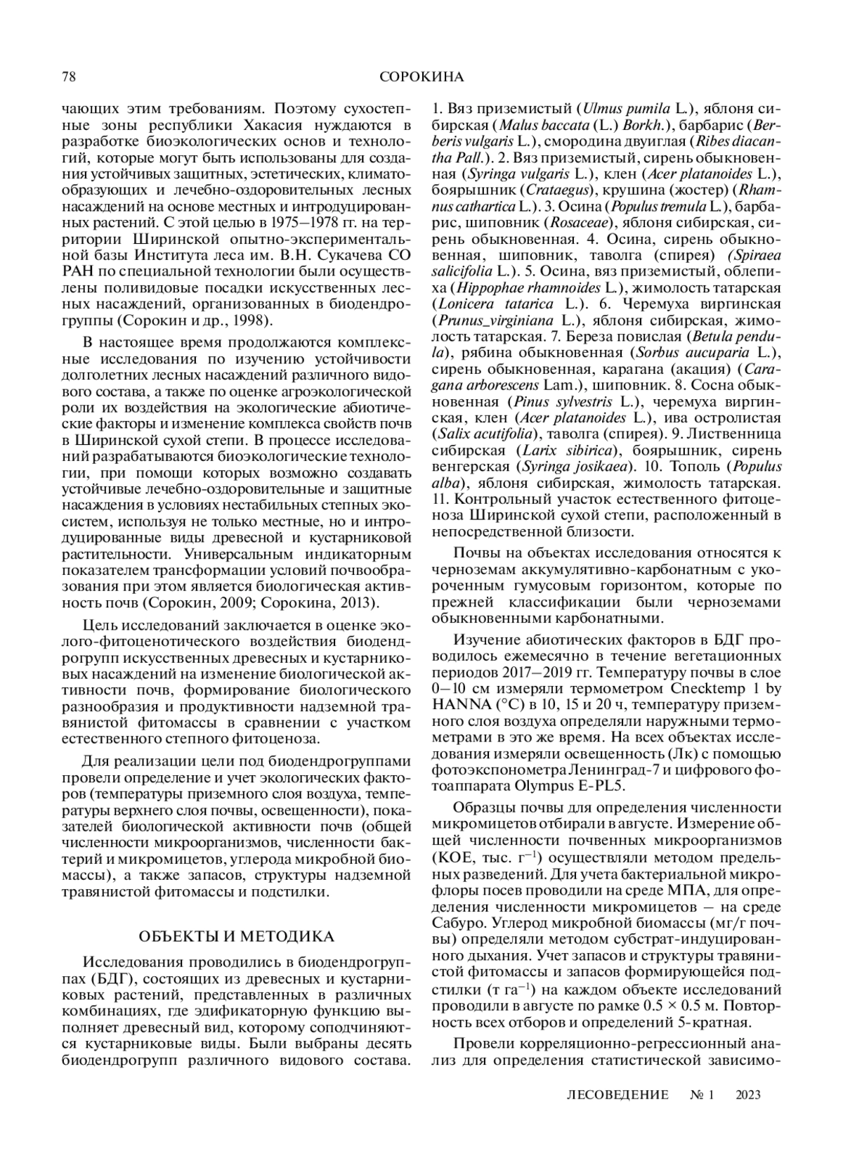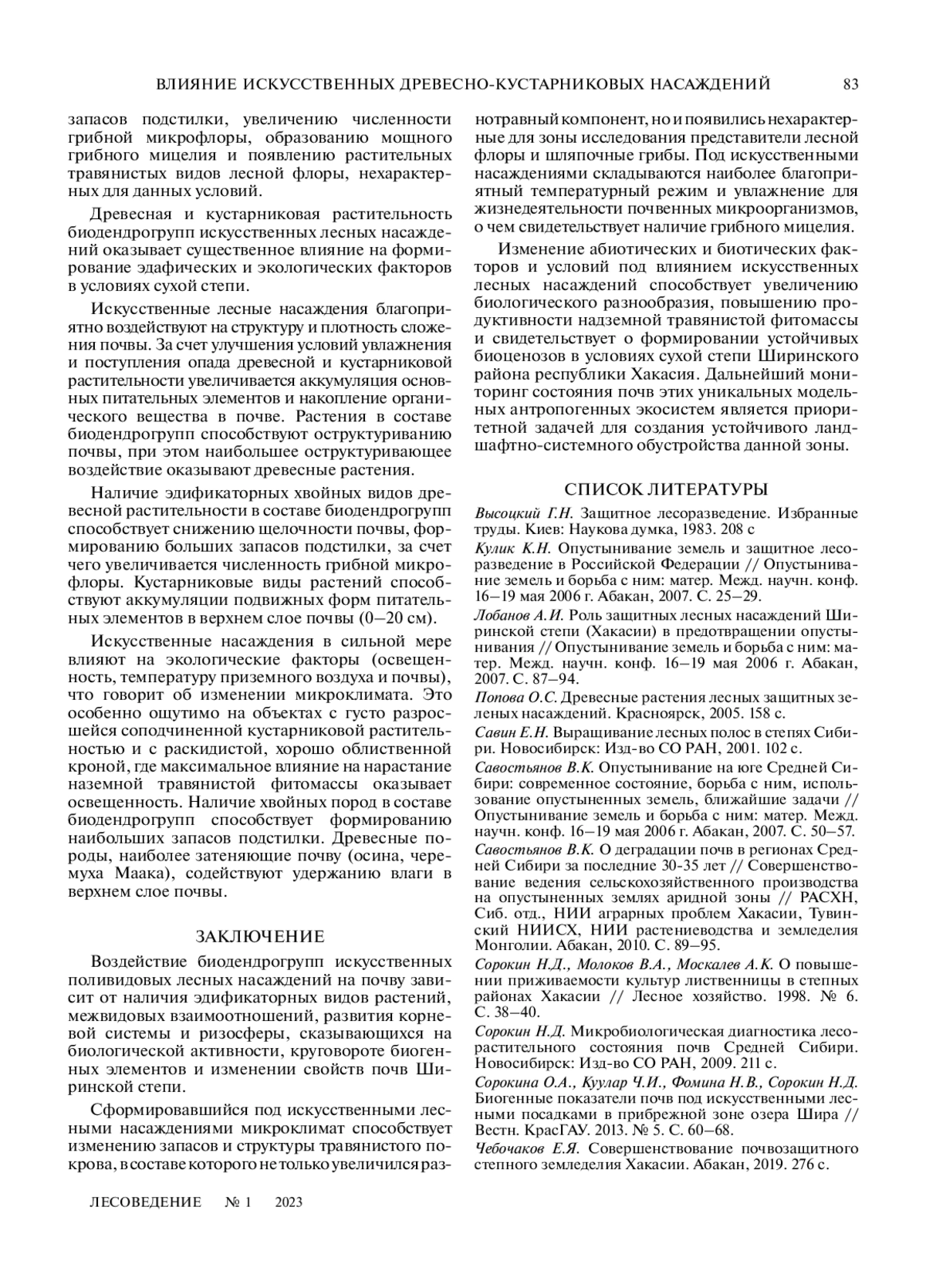СОРОКИНА О. А. ВЛИЯНИЕ ИСКУССТВЕННЫХ ДРЕВЕСНО-КУСТАРНИКОВЫХ НАСАЖДЕНИЙ НА БИОЛОГИЧЕСКУЮ АКТИВНОСТЬ ПОЧВ В СТЕПЯХ ХАКАСИИ // ЛЕСОВЕДЕНИЕ. 2023. № 1