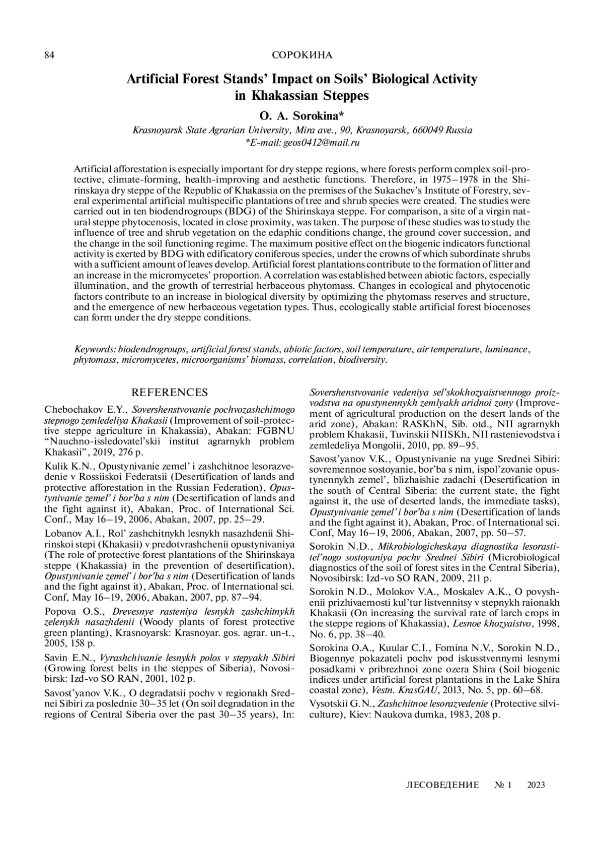 Статья: ВЛИЯНИЕ ИСКУССТВЕННЫХ ДРЕВЕСНО-КУСТАРНИКОВЫХ НАСАЖДЕНИЙ НА БИОЛОГИЧЕСКУЮ АКТИВНОСТЬ ПОЧВ В СТЕПЯХ ХАКАСИИ (2023)